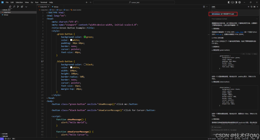 针对整个项目进行问答,和针对单个文件的操作相同,只是选中时点击Codebase然后对整个项目进行提问和编辑,这个功能可以帮助快速上手一个新的项目或者找到项目中的关键组件。