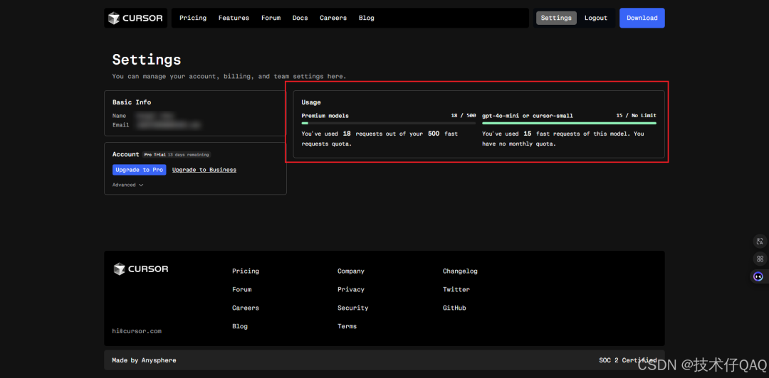 但唯一的困扰是模型的使用次数有限制,超过次数就要收费,下一节介绍如何快速解决这个问题,希望Cursor的出现能给广大码友释放双手,留有更多的时间学习技术,关注技术本身。