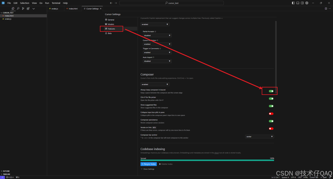 Ctrl+i由于过于强大,所以想单独在这里介绍,Ctrl+i是专为整个项目设计的,可以通过和模型对话来开发整个项目,过程就和聊天差不多,在会话中可以帮助你创建文件、删除文件、同时编辑多个文件等功能。使用Ctrl+i需要打开设置中的按钮: