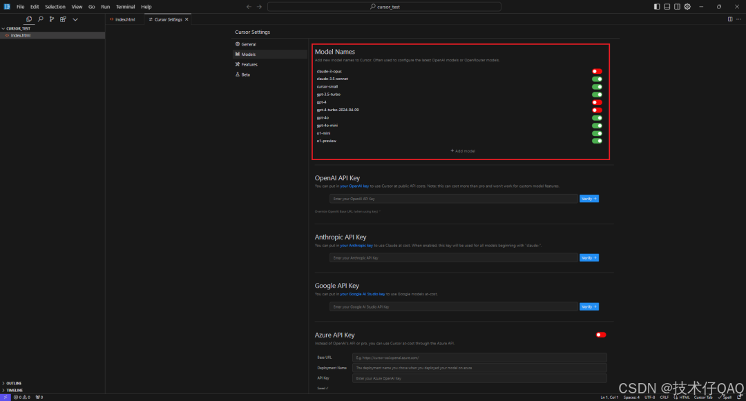 cursor内置了很多LLMs,包括最先进的GPT4s、Claude3.5s和openai最新发布的推理模型o1-preview和o1-mini,在右上角的设置中即可打开相应的模型进行辅助编程。平时用的最多的还是Claude3.5和GPT4,因为代码能力真的很强悍,后面会展示。