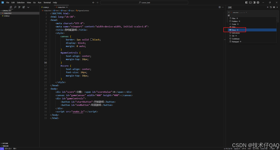 加入文档之后,使用文档进行提问的方式和单个文件一样,使用Ctrl+L唤起对话框,然后输入@,点击docs选择添加好的文档即可。