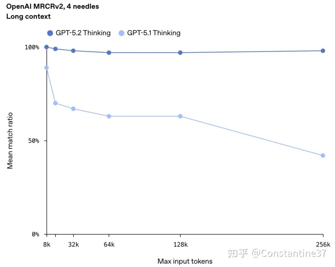 在最多256k token的上下文中,GPT-5.2还是首个接近100%准确率的模型!