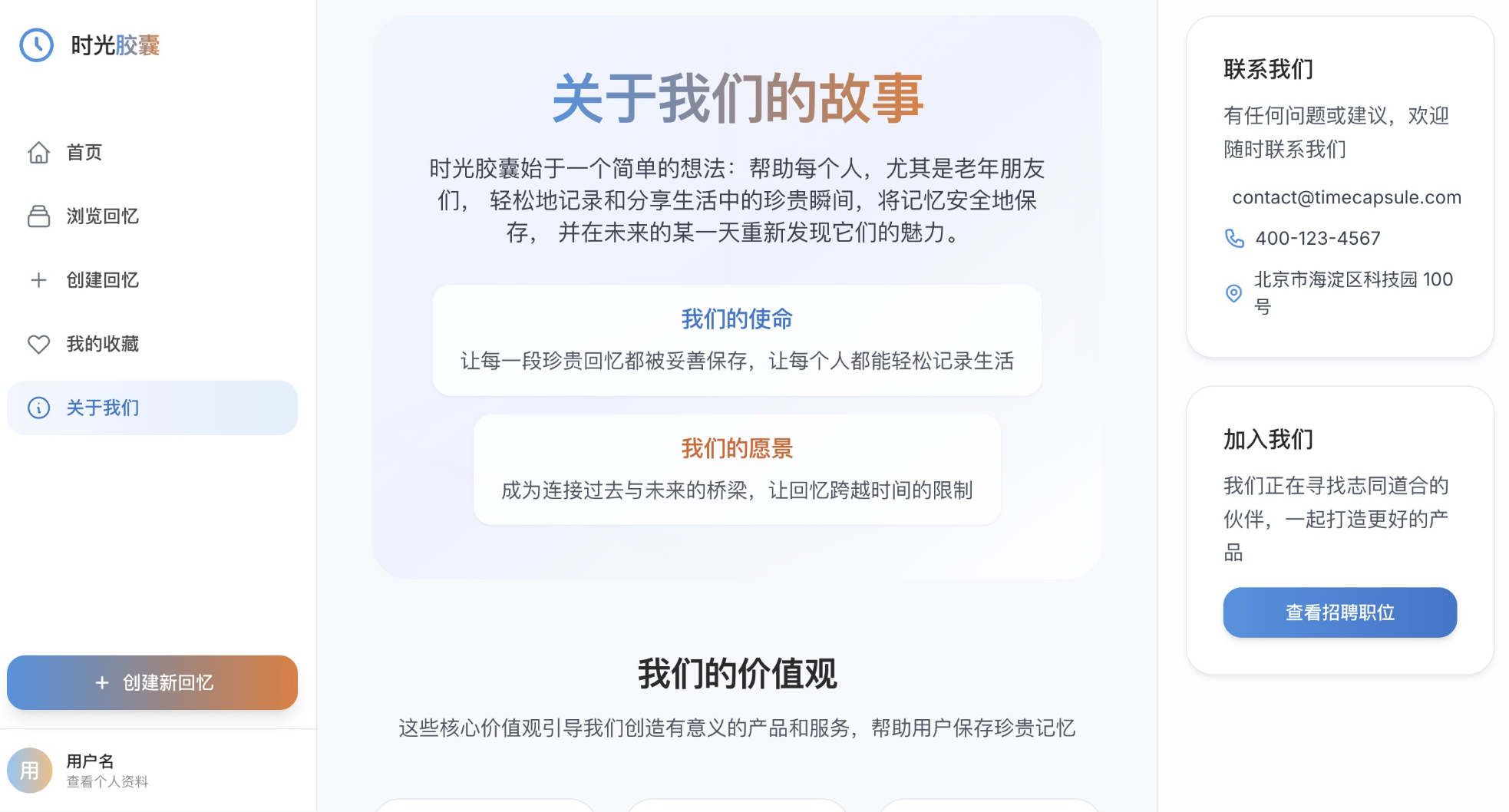 - 页面顶端显眼位置放置项目名称:“给你一颗时光胶囊”,配上温暖、治愈风格的图标或logo。