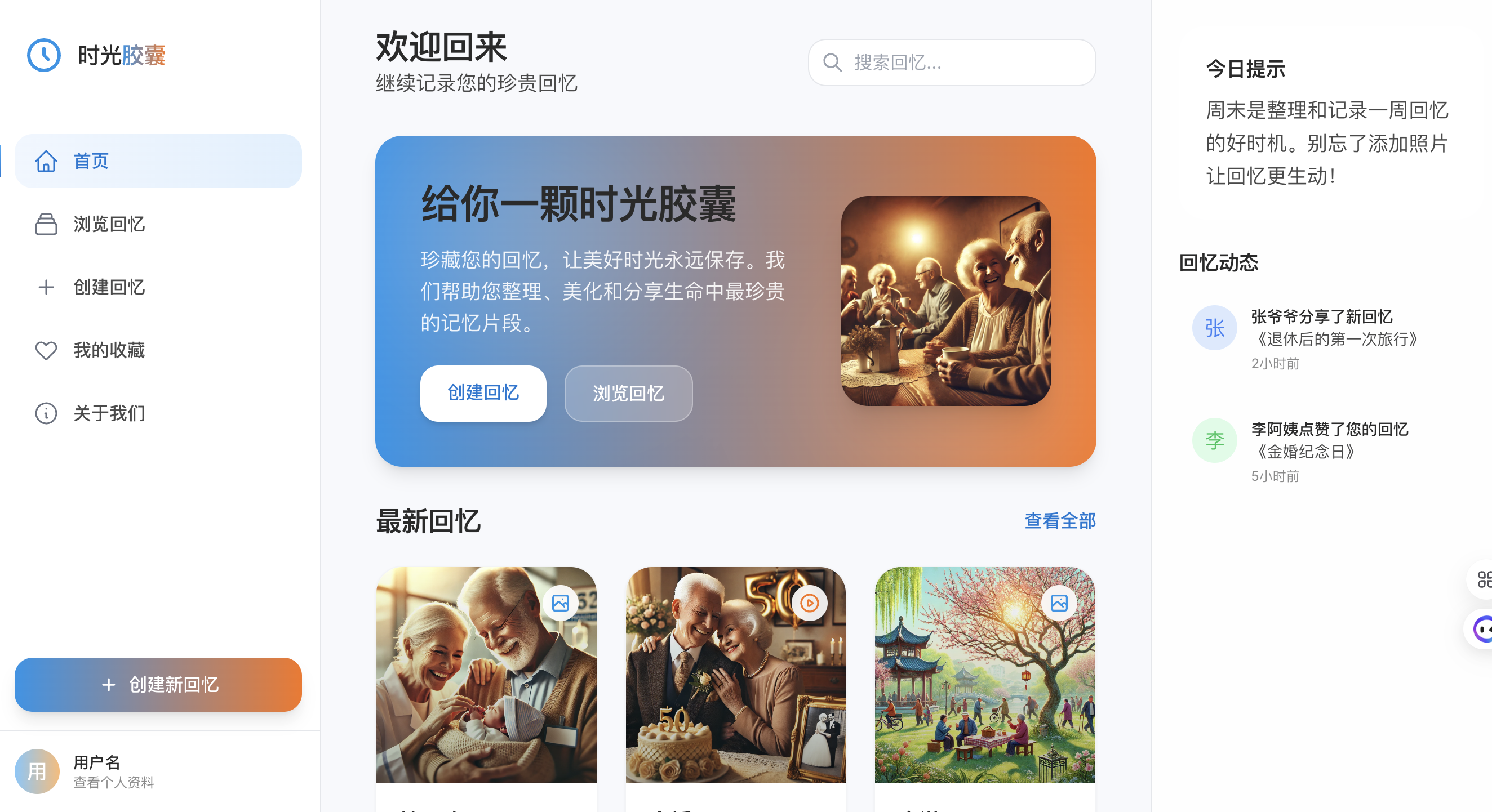 - 导航栏设计简洁,包括“首页”、“我的回忆”、“关于我们”等基础栏目。
