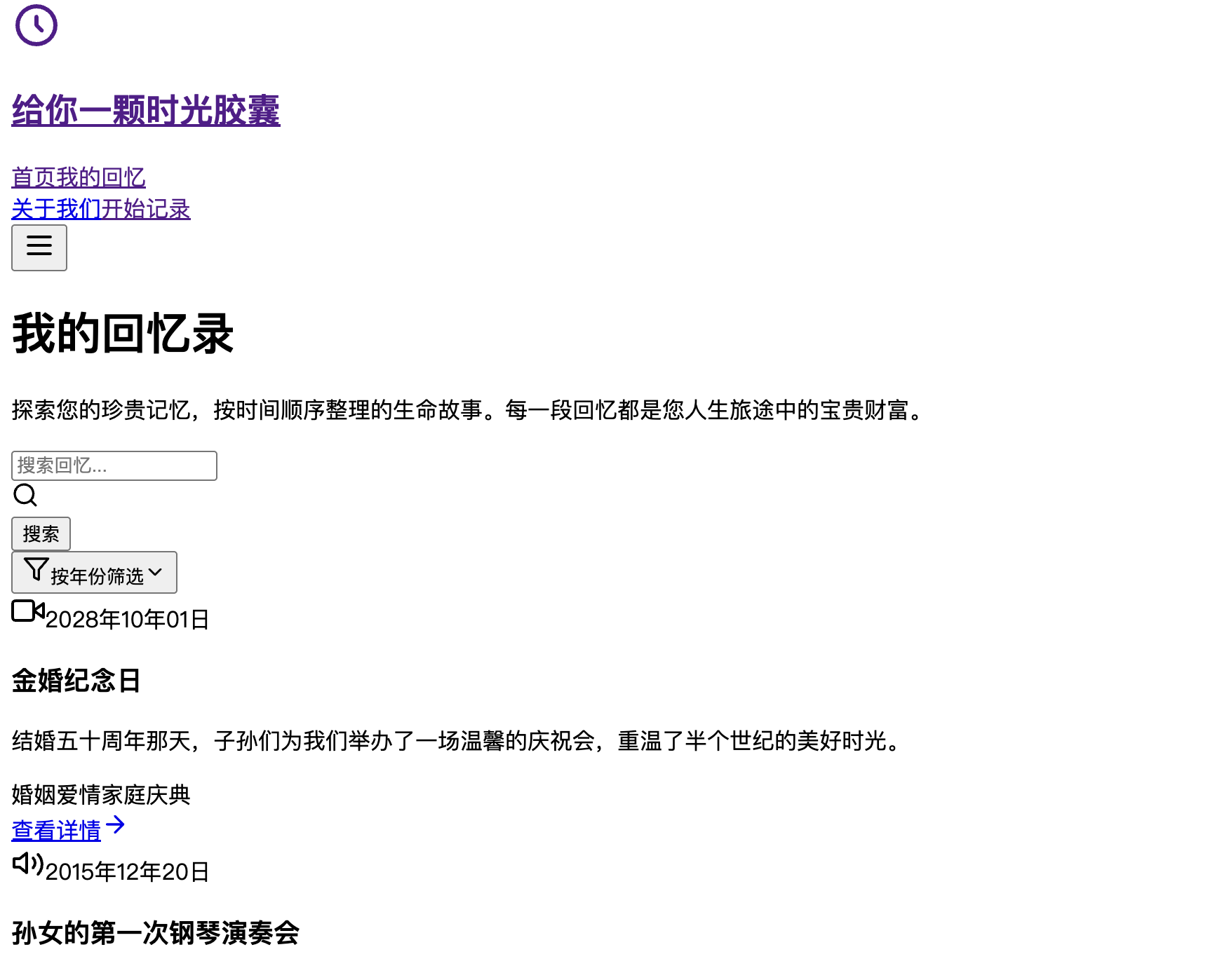 - 提供按时间年份或月份筛选记忆的下拉菜单,方便快速找到特定时间段的回忆。