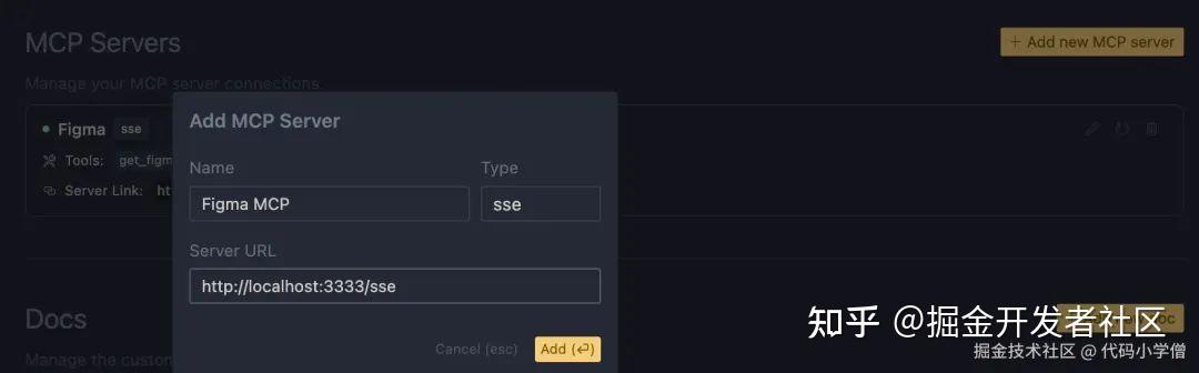 Cursor 不用介绍了吧。大名鼎鼎的 AI IDE Cursor 官网[3] 他支持绑定 MCP 服务,我使用的 0.45 版本,应该此版本以上都支持。在 Setting 中找到 MCP Server 进行添加配置。