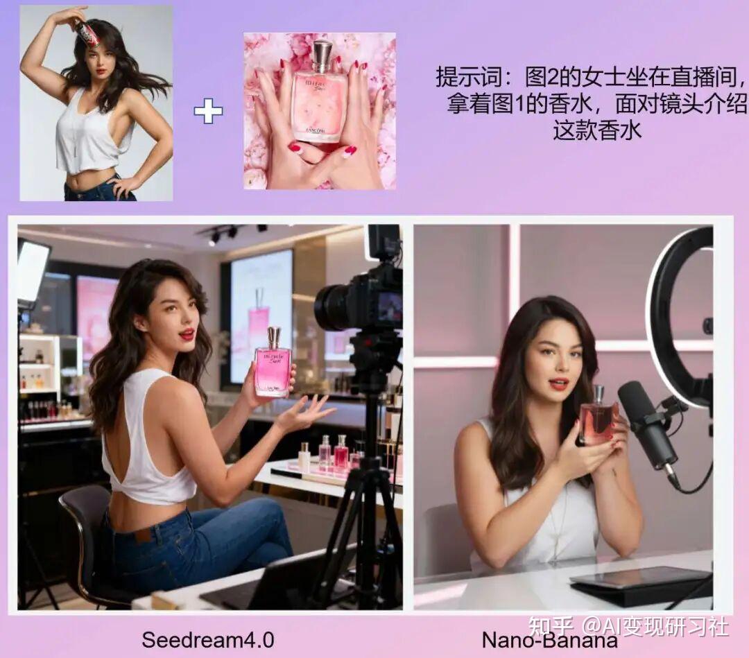 提示词:图 2 的女士坐在直播间,拿着图 1 的香水,面对镜头介绍这款香水