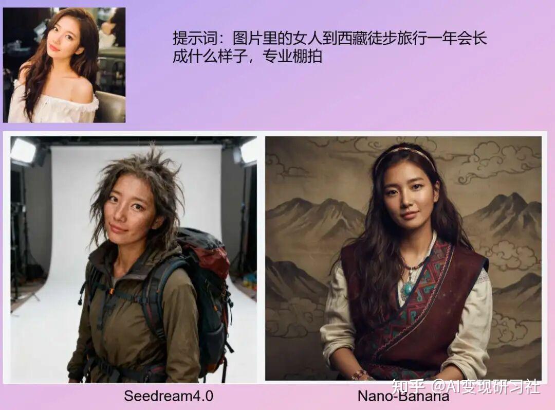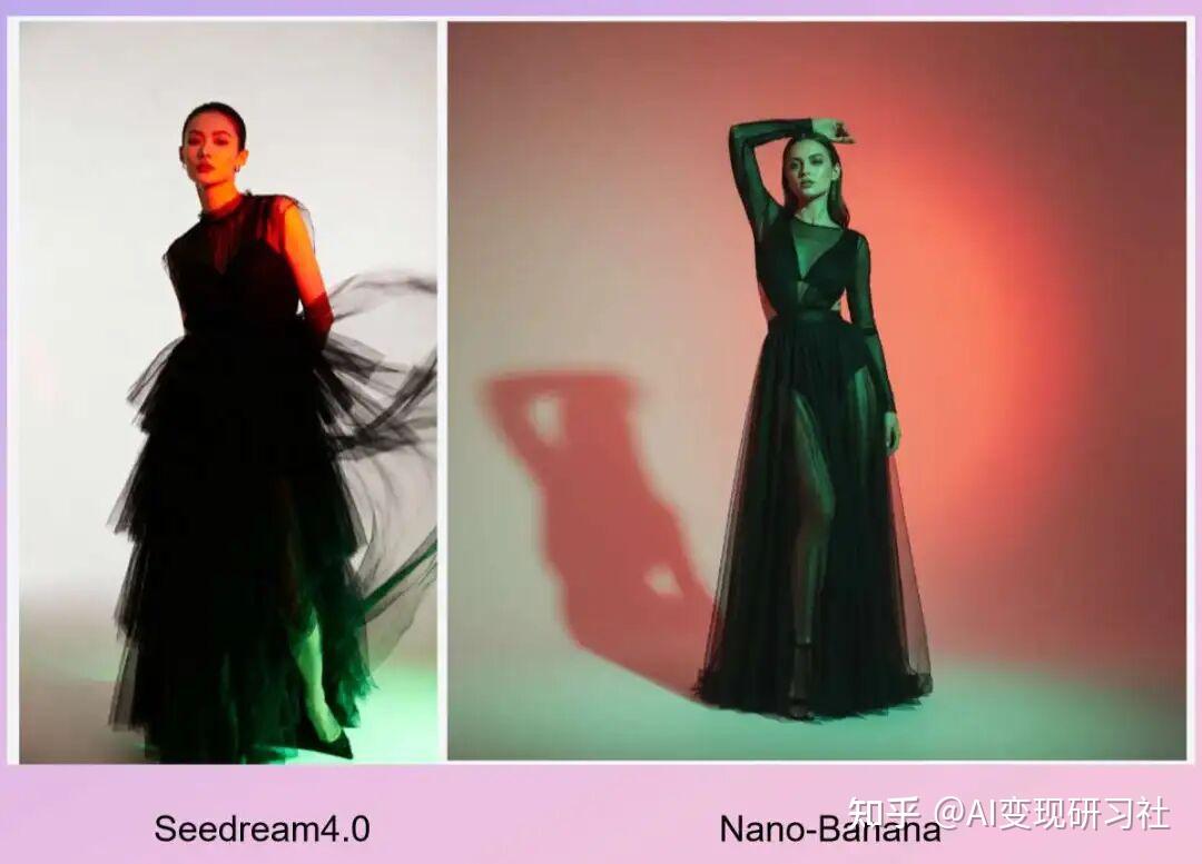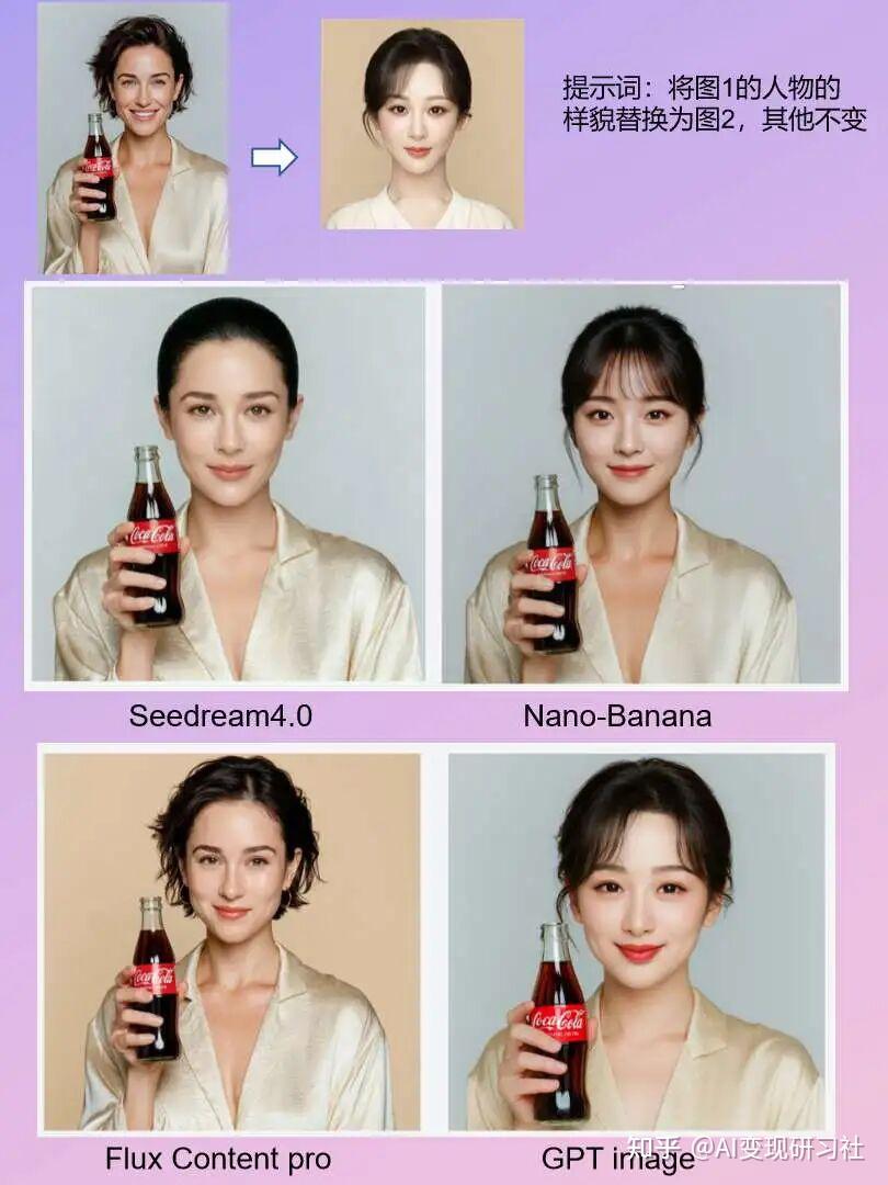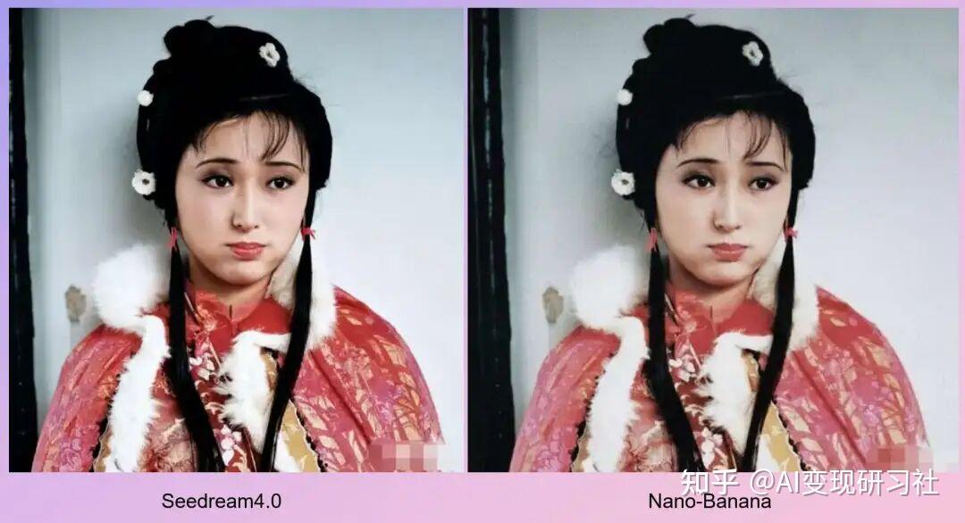 可以看到各有优劣,Nano-Banana 对人物面容保持得更好,而即梦 4 则会受到干扰。