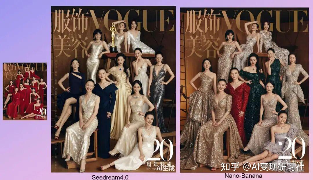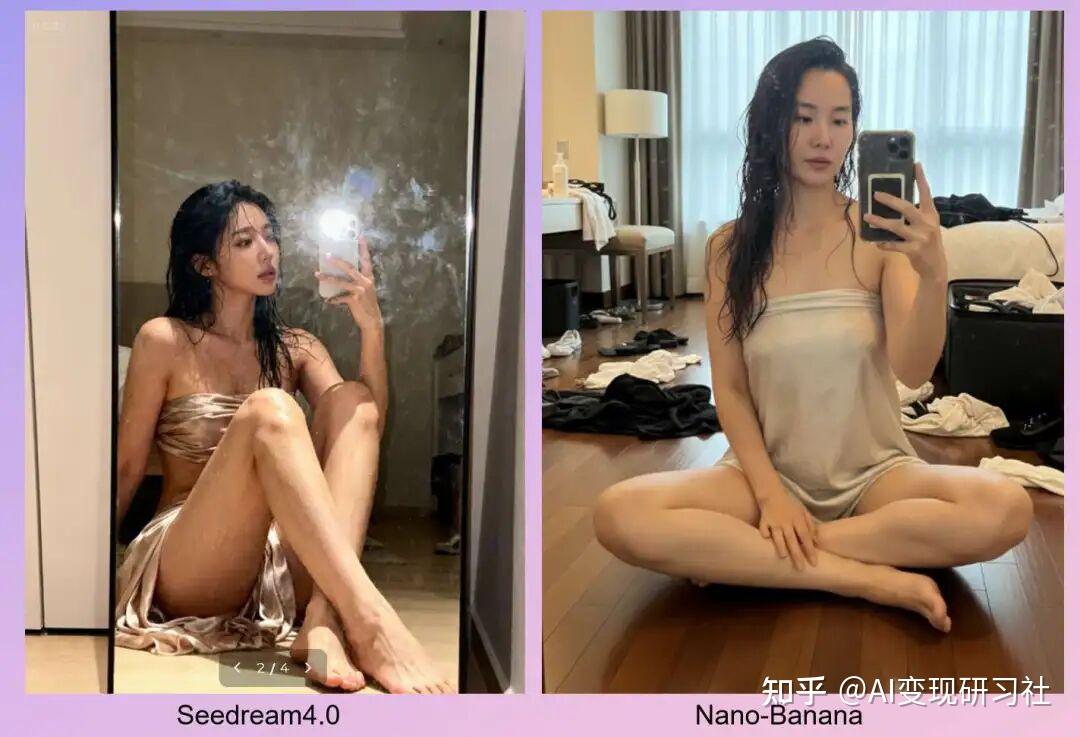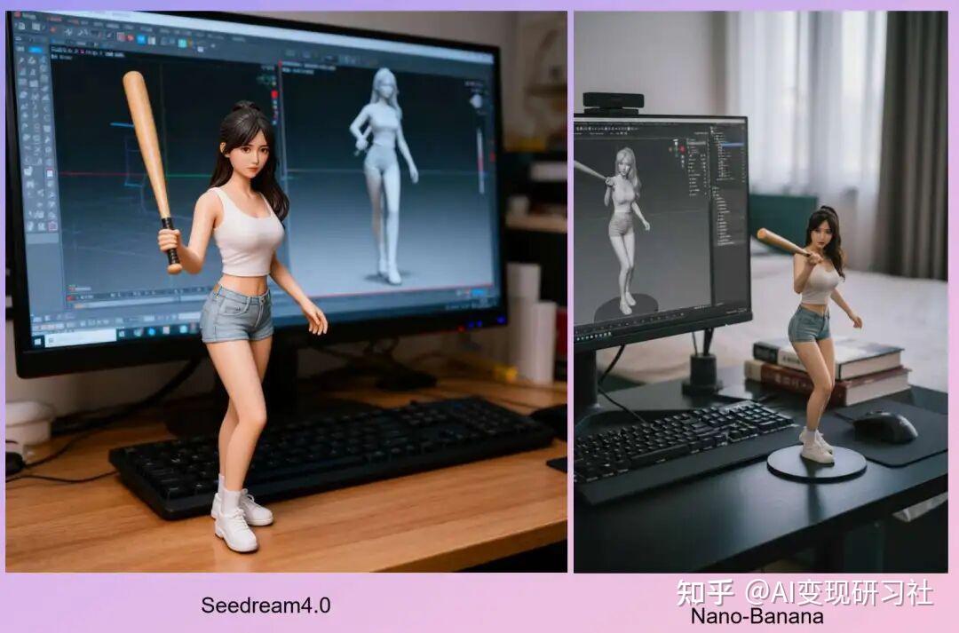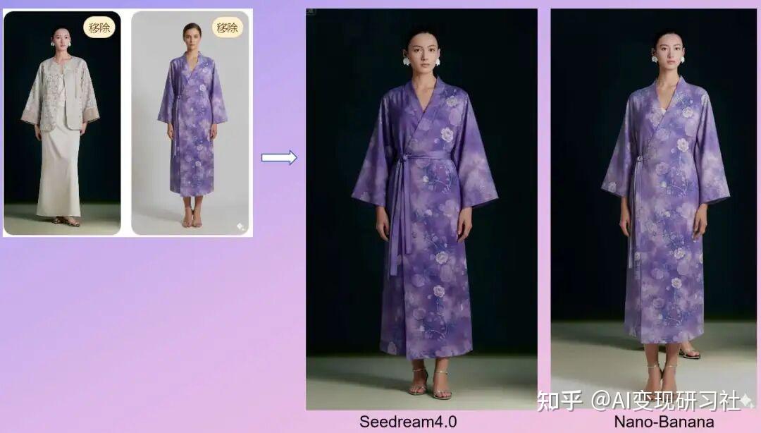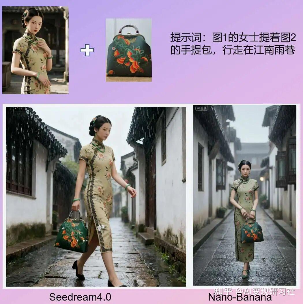 可以看到各有优劣,Nano-Banana 对人物面容保持得更好,而即梦 4 则会受到干扰。