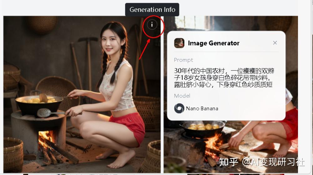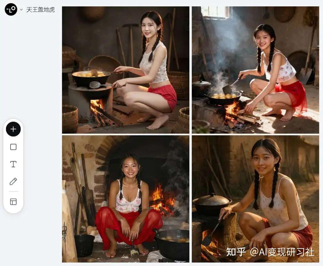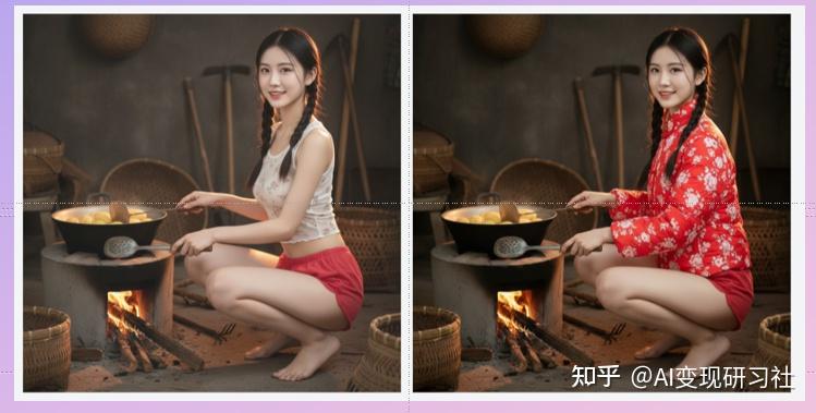 提示词:30 年代的中国农村,一位瘦瘦的双辫子 18 岁女孩身穿白色碎花吊带纱料。露肚脐小背心,下身穿红色纱质质短裤。面向镜头,蹲着。手拿锅铲。光脚,蹲在灶台旁添加木柴,火旺,锅里炖着土豆,农具,一束温暖的侧逆光打在身上,面露微笑。超高清 32k