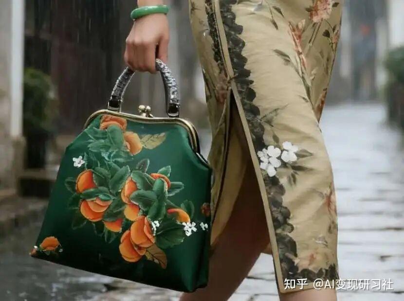 提示词:图 1 的女士提着图 2 的手提包,行走在江南雨巷