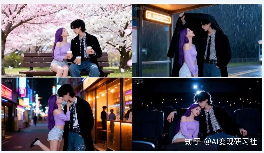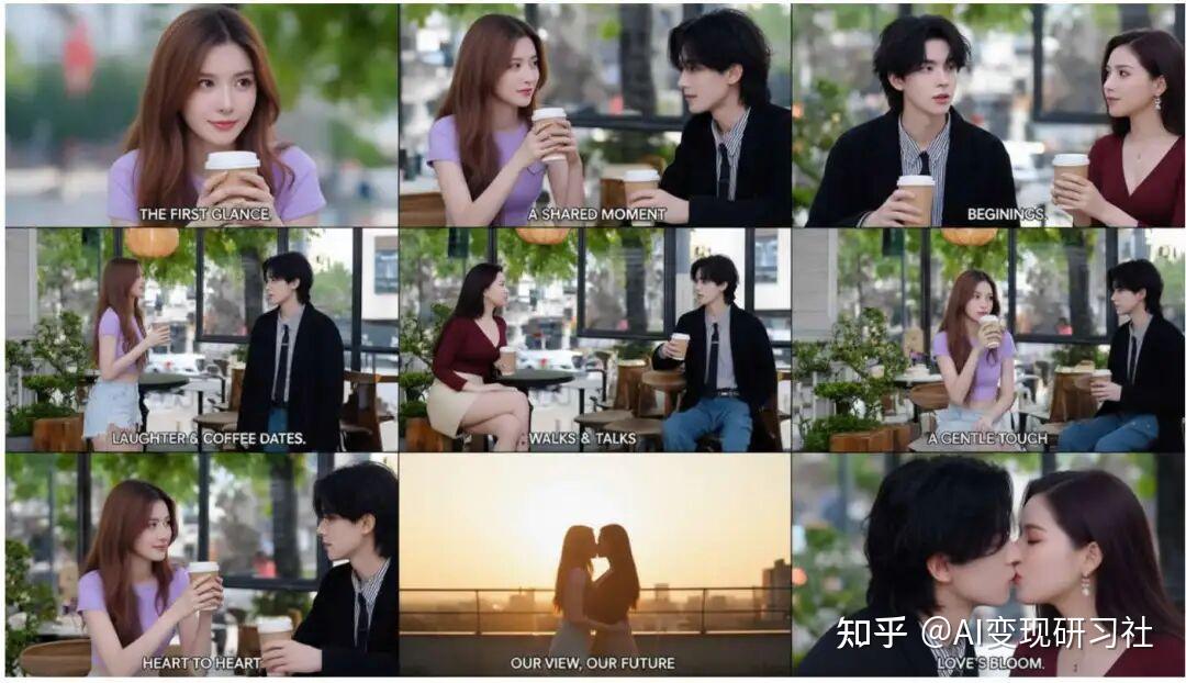 提示词:参考图片形象生成一组爱情片分镜图片,九宫格输出