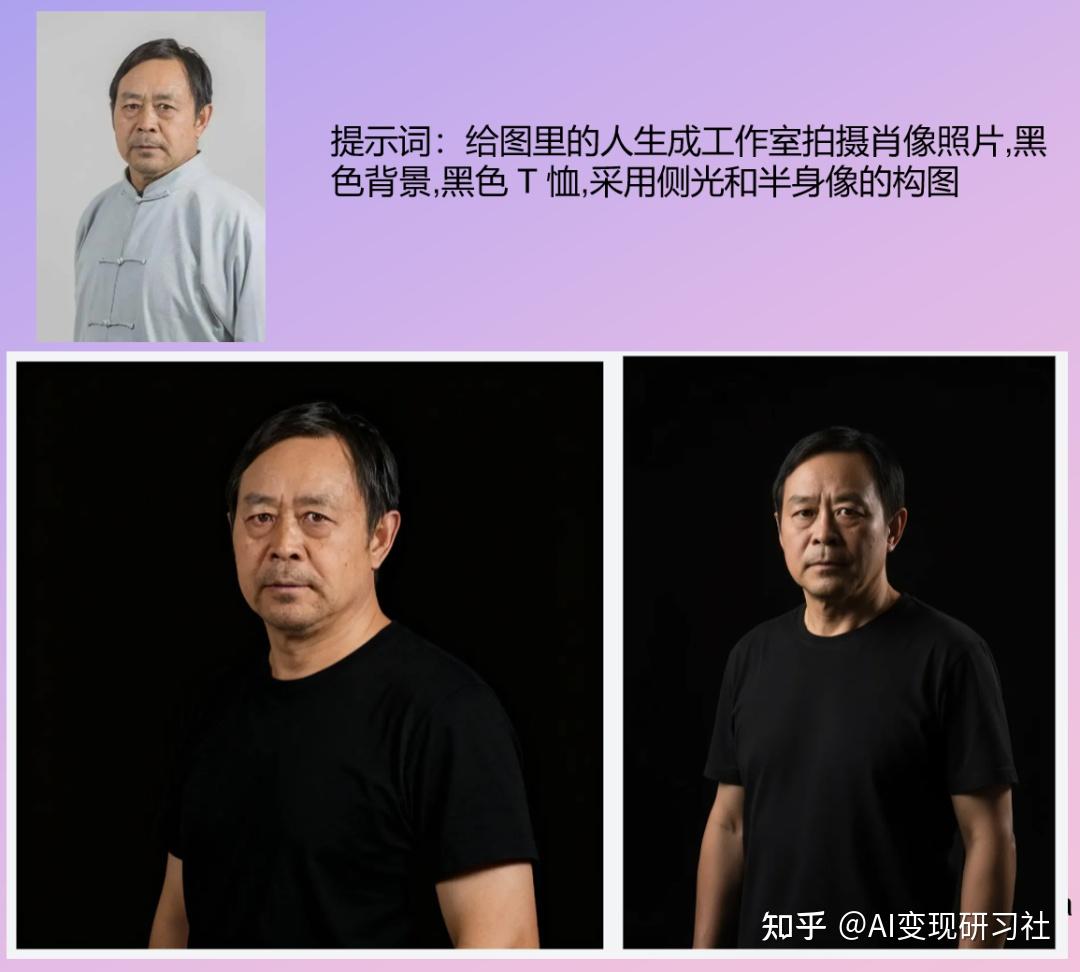 提示词:给图里的人生成工作室拍摄肖像照片,黑色背景,黑色 T 恤,采用侧光和半身像的构图
