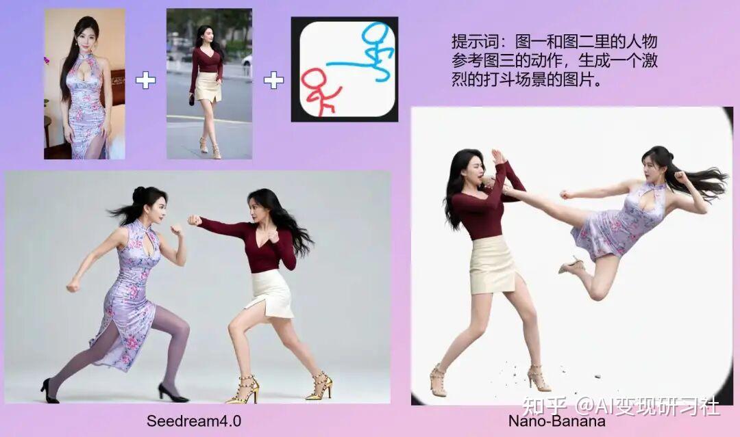 即梦 4 倒是打斗激烈了,但是动作模仿不到位;Nano-Banana 动作模仿到位了,就是融合得不太雅观