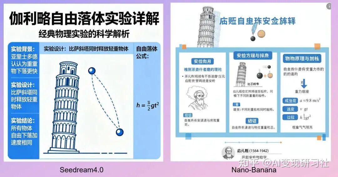 提示词:“伽利略自由落体实验详解”信息图表,包括科普文字、示意图和基础物理公式,分列进行排版