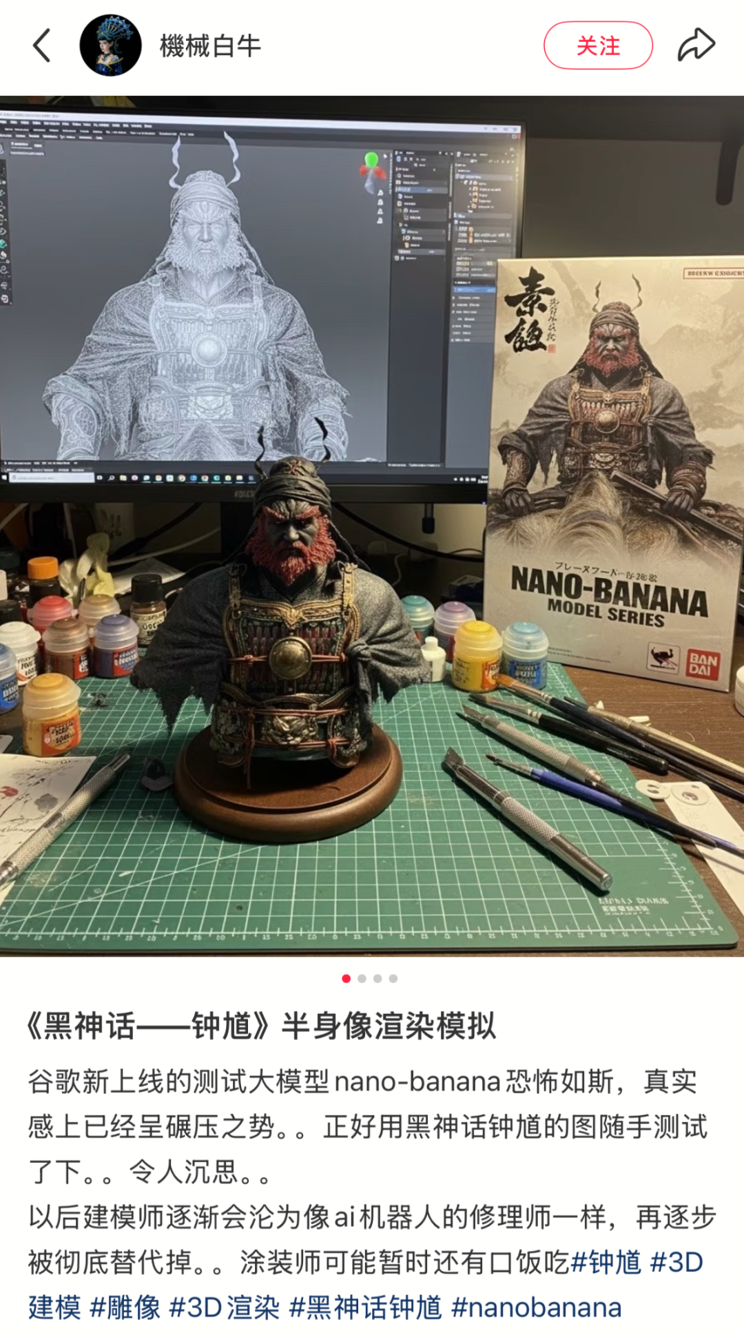 例如,有人给最近大火的《黑神话·钟馗》做了钟馗的手办图,细节拉满,神态动作完全复刻。