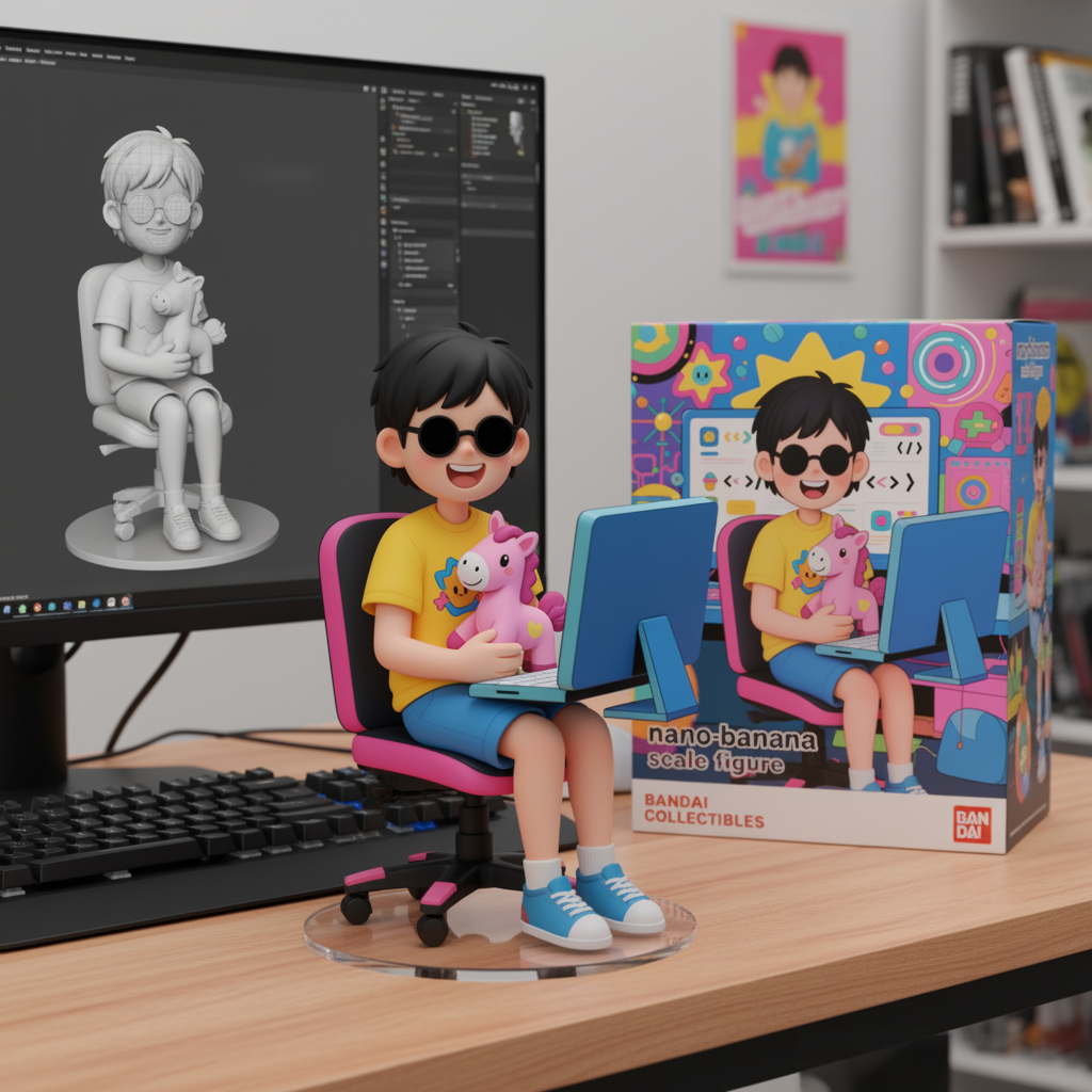 Using the nano-banana model, a commercial 1⁄7 scale figurine of the characterin the picture was created, depicting a realistic style and a realistic environment. The figurine is placed on a computer desk with a round transparent acrylic base. There isnotexton the base. The computer screen shows the Zbrush modeling process of the figurine. Next to the computer screen is a BANDAI-style toy boxwith the original painting printed on it.