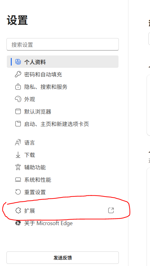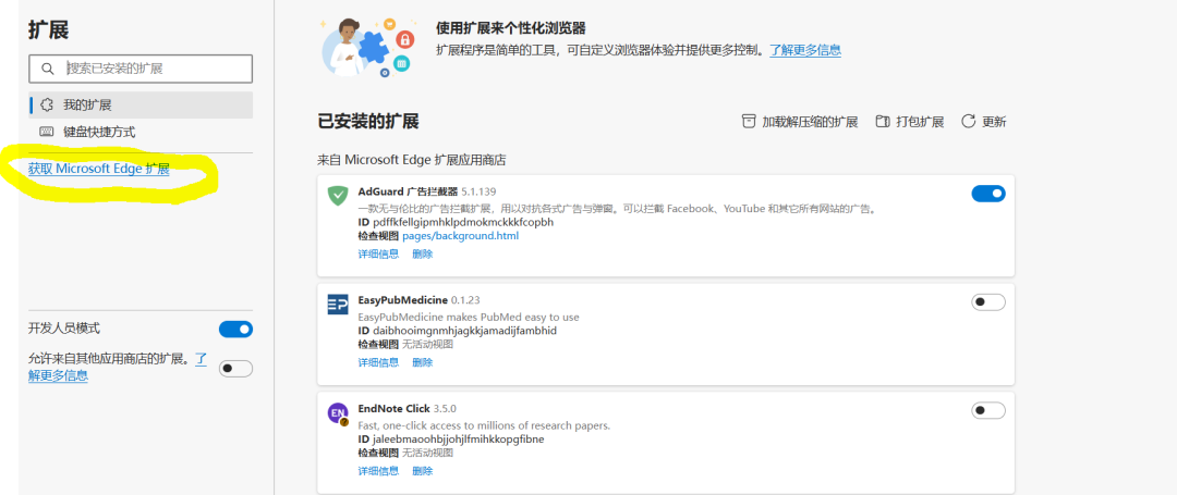 Edge浏览器-右上角的三个点-设置-(新打开页面的左边)拓展-(新打开页面)获取Microsoft edge 拓展