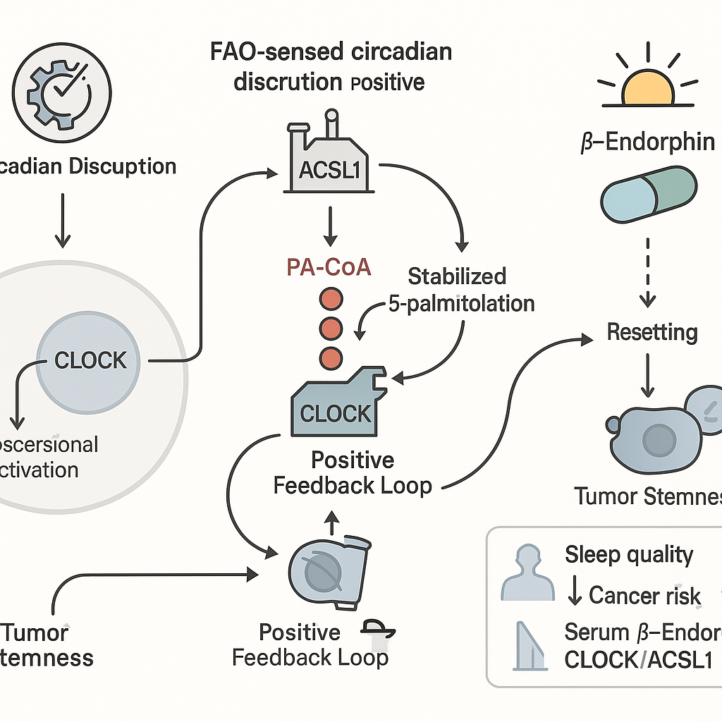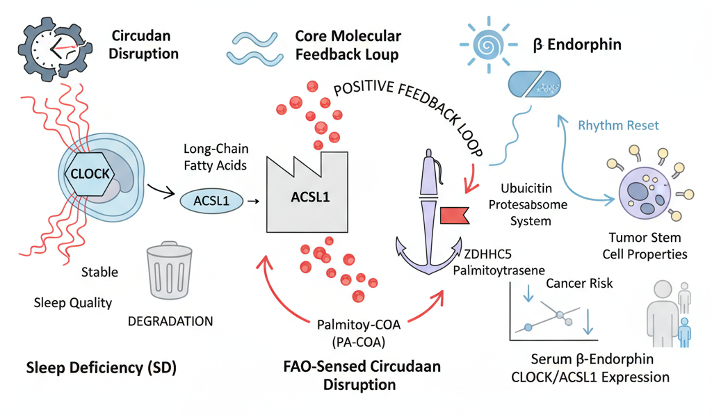 A BioRender-style schematic illustration, exceptionally clear and professional, depicting the molecular mechanism by which sleep deficiency (SD) disrupts the circadian clock to enhance lung tumorigenesis through a fatty acid oxidation (FAO)-sensed positive feedback loop, and its potential chronotherapeutic intervention by β-endorphin.