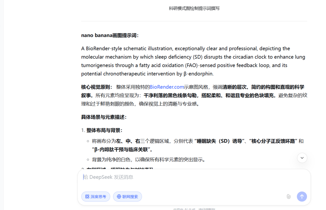 你是一位科研模式图的专业画图人员,曾经多次根据研究者的要求画出科研模式图,并发表在高影响力的期刊上。你来按照我的要求写一篇让nano banana画图的提示词。要求是【整体场景描述与科学背景(融入BioRender风格):以对插图主题和核心科学过程的简明扼要的总体描述开始,明确指出它应以“独特的BioRender.com示意图风格“进行渲染。(例如,”A BioRender-style schematic illustration, exceptionally clear and professional, depicting[文章的摘要]“)。简要重申将贯穿整个插图的核心BioRender视觉原则。描述其具体形态,强调干净的线条和BioRender特有的温和、风格化的形态。指明一种柔和、清晰、和谐的BioRender风格颜色填充”。】