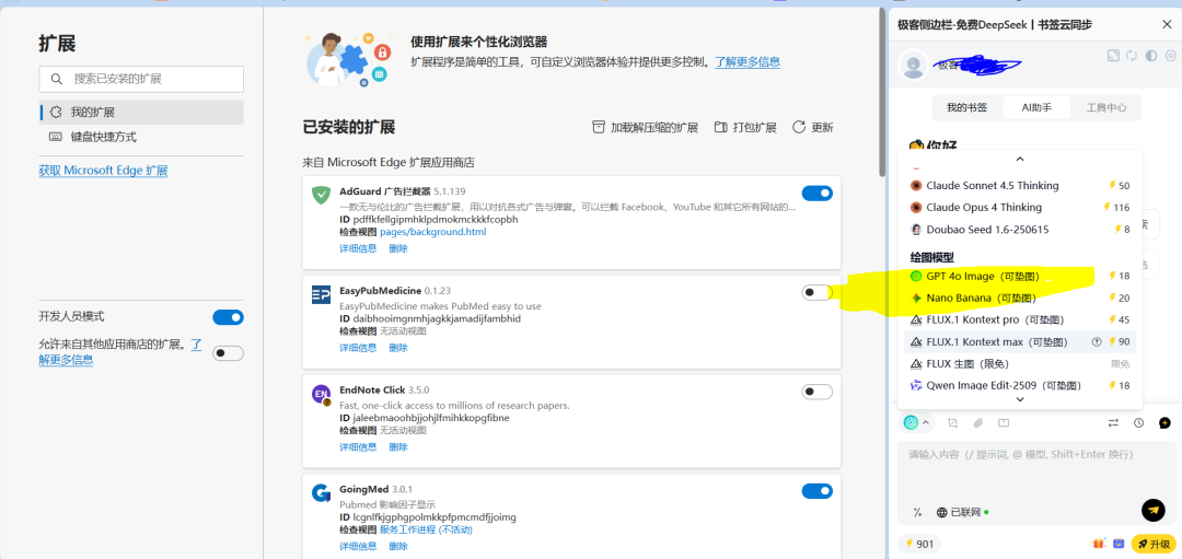 选择Nano Banana(可垫图)或者GPT 4o image(可垫图)将上面deepseek给我们写的提示词放入极客侧边栏