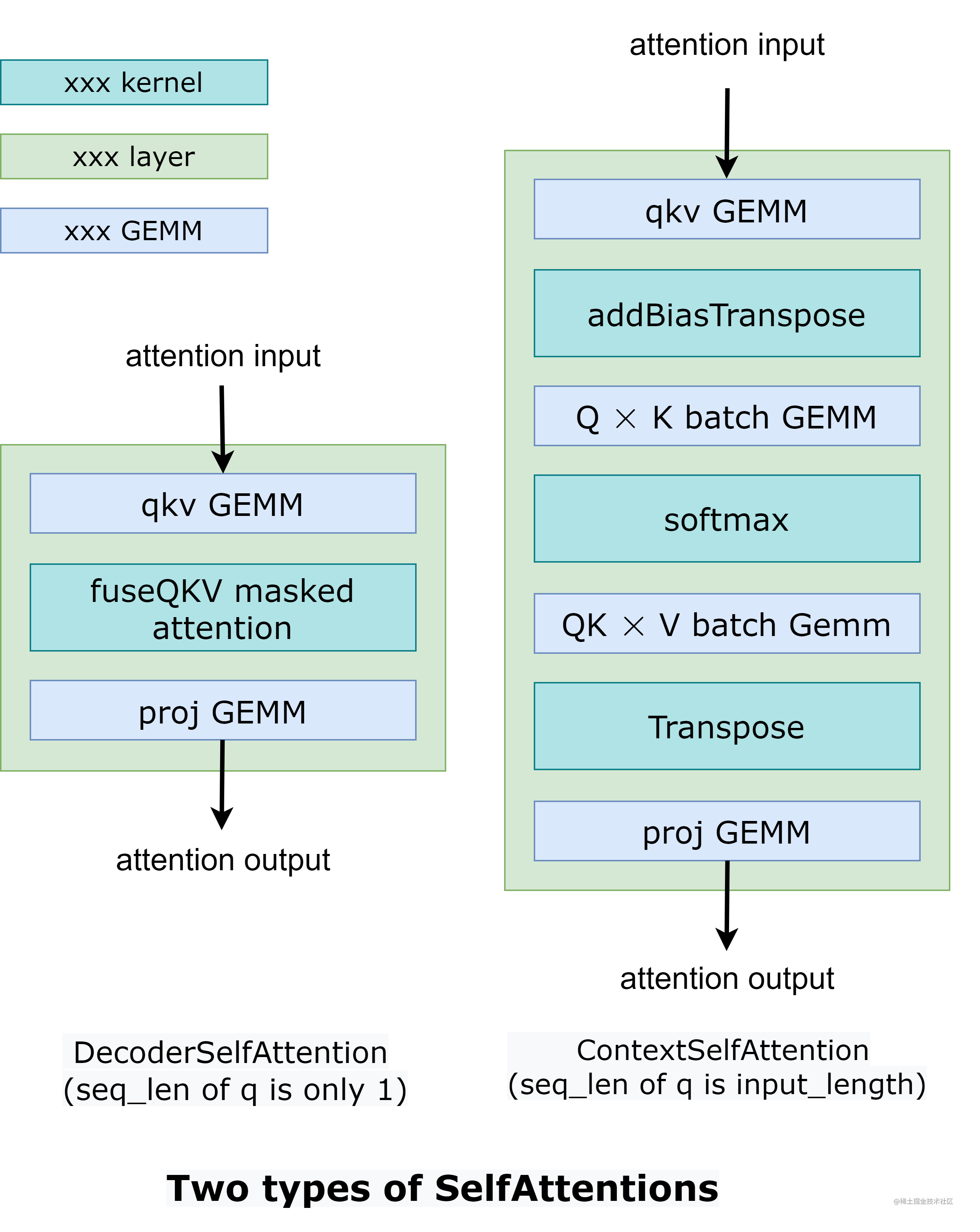在 DecoderSelfAttention 中,查询的序列长度始终为 1,因此我们使用自定义的 fused masked multi-head attention kernel 来处理。 另一方面,ContextSelfAttention 中查询的序列长度是最大输入长度,因此我们使用 cuBLAS 来利用tensor core。