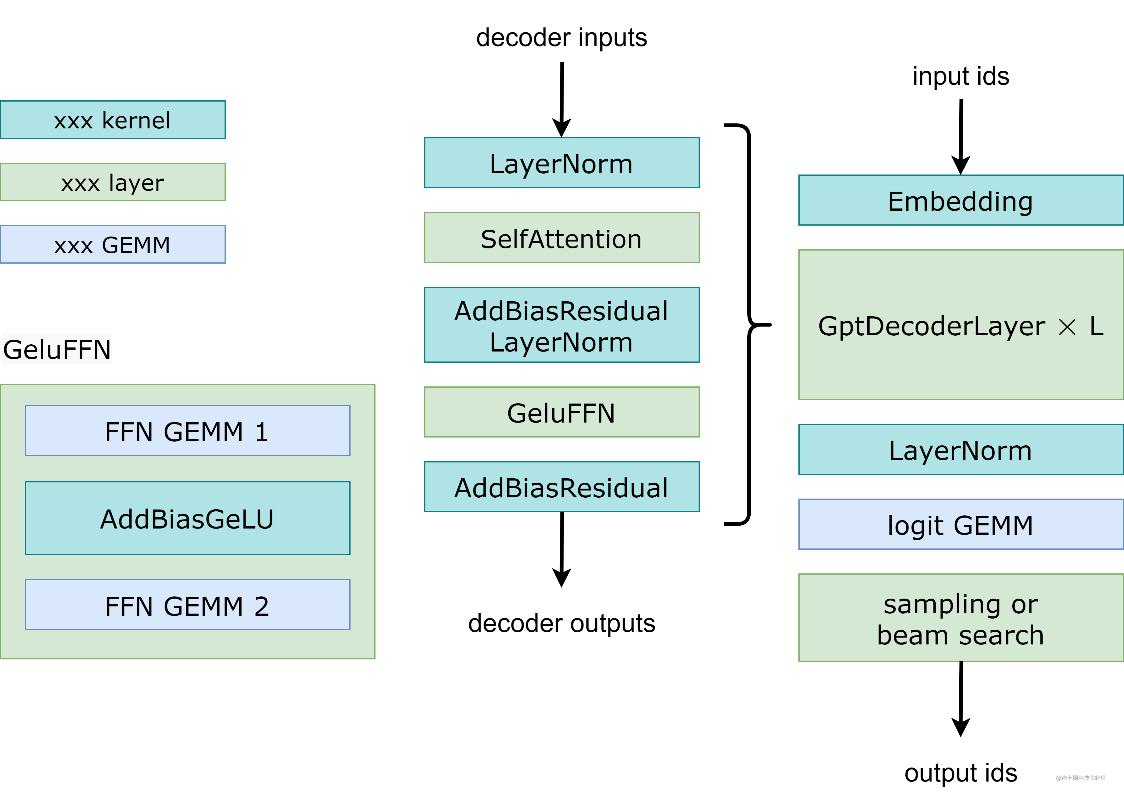 下图展示了 FasterTransformer GPT 的工作流程。 与 BERT(仅编码器结构) 和编码器-解码器结构不同,GPT 接收一些输入 id 作为上下文,并生成相应的输出 id 作为响应。 在此工作流程中,主要瓶颈是 GptDecoderLayer(transformer块),因为当我们增加层数时,时间会线性增加。 在 GPT-3 中,GptDecoderLayer 占用了大约 95% 的总时间。