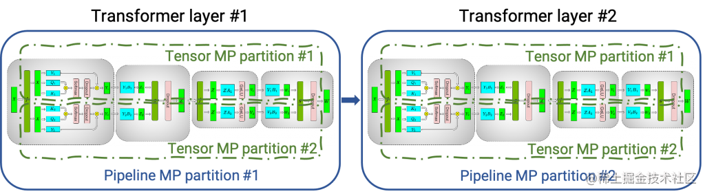 下图显示了如何使用张量并行 (TP) 和流水线并行 (PP) 技术将基于Transformer架构的神经网络拆分到多个 GPU 和节点上。
