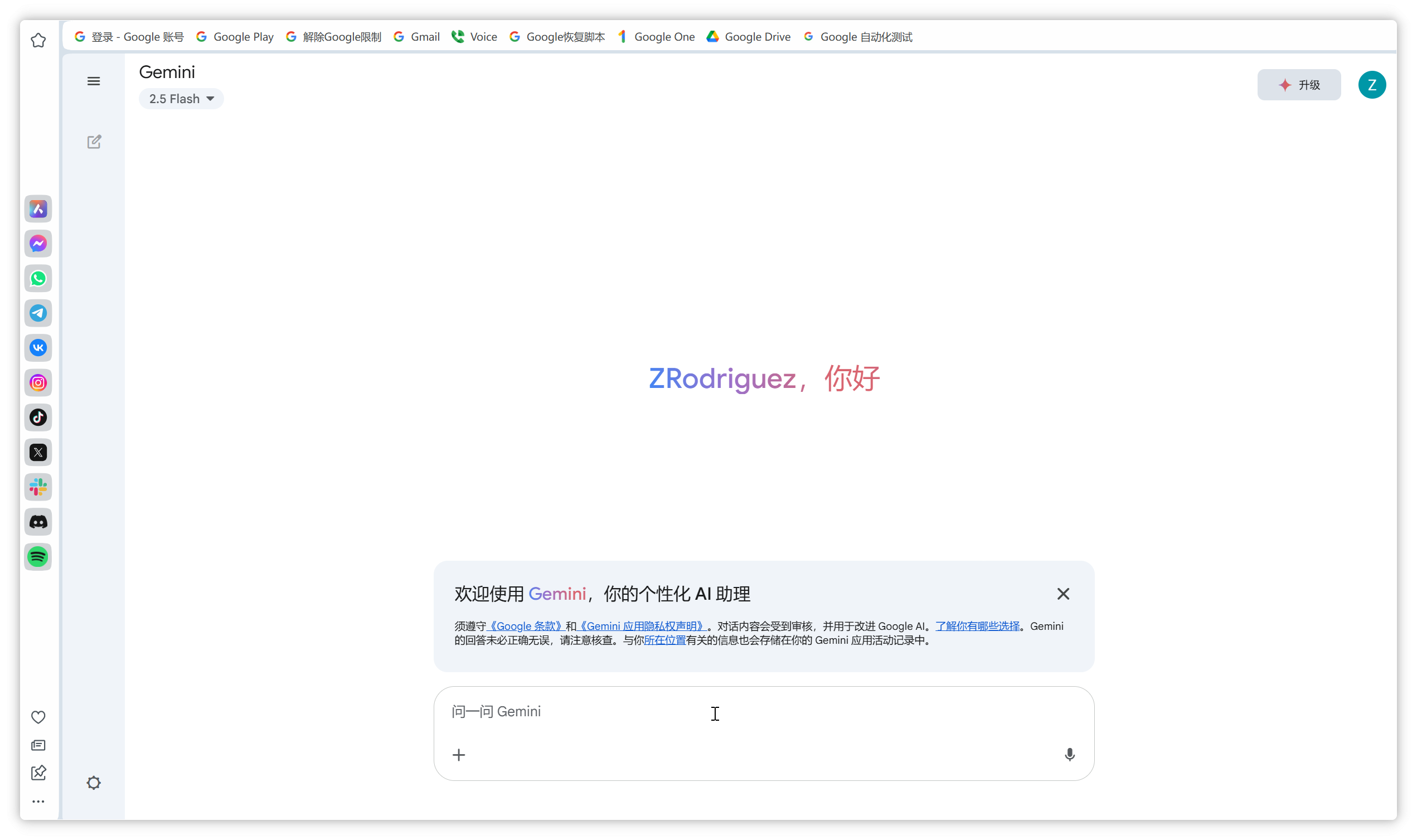 经过这几天的努力,总算找到了成功使用Gemini的注册方法,下面是我成功打开Gemini的页面,再也没有提示【出了点问题,稍后再试】了!