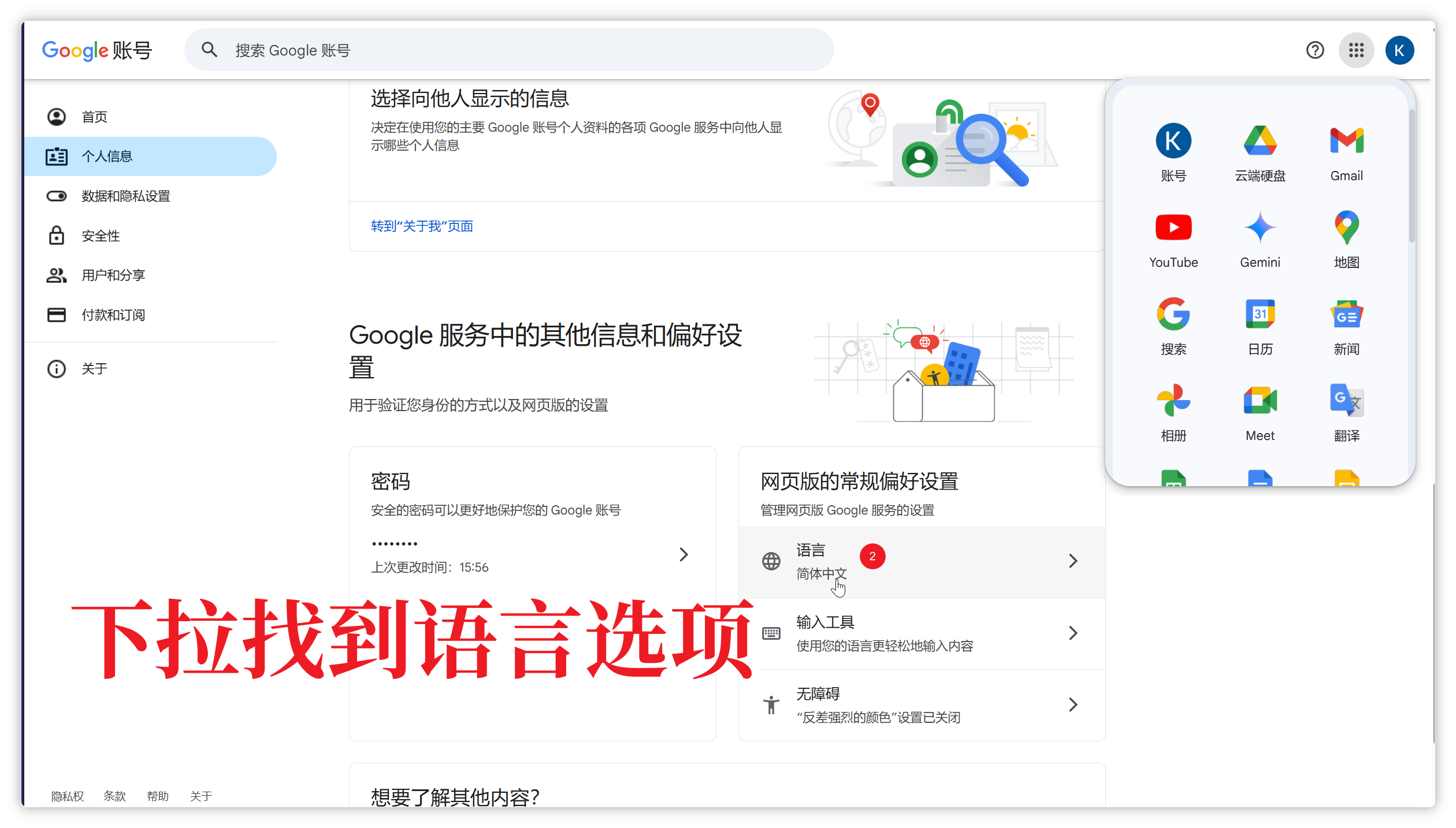 下面打开个人信息一栏,然后下拉找到语言选项,我们需要调整语言为英文。