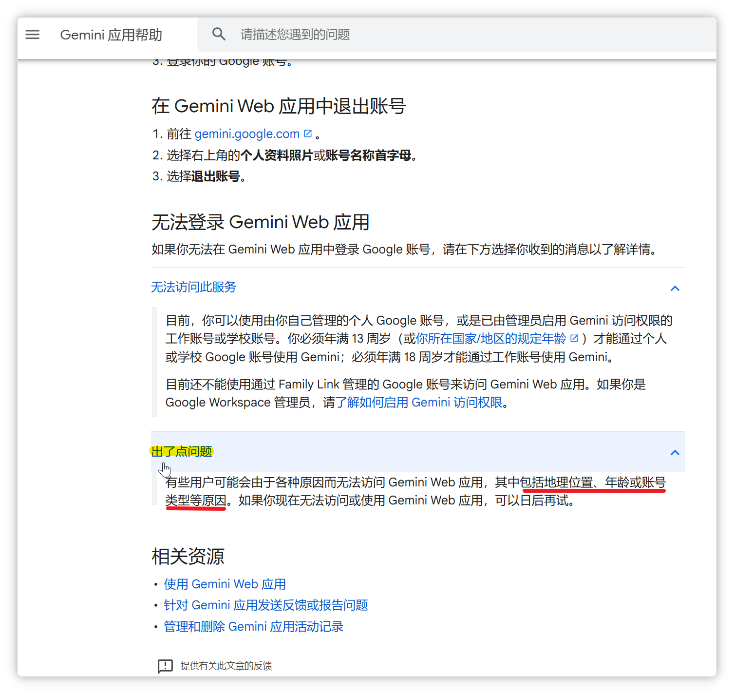 一开始我以为是不同地区的谷歌账号显示问题,后来改了美区谷歌,依然无济于事。可以确认的是,谷歌官网会认为你的账号没有权限使用Gemini,我查询了一下Gemini的使用帮助说明,官网早就列出了【出现点问题】提示的说明情况。