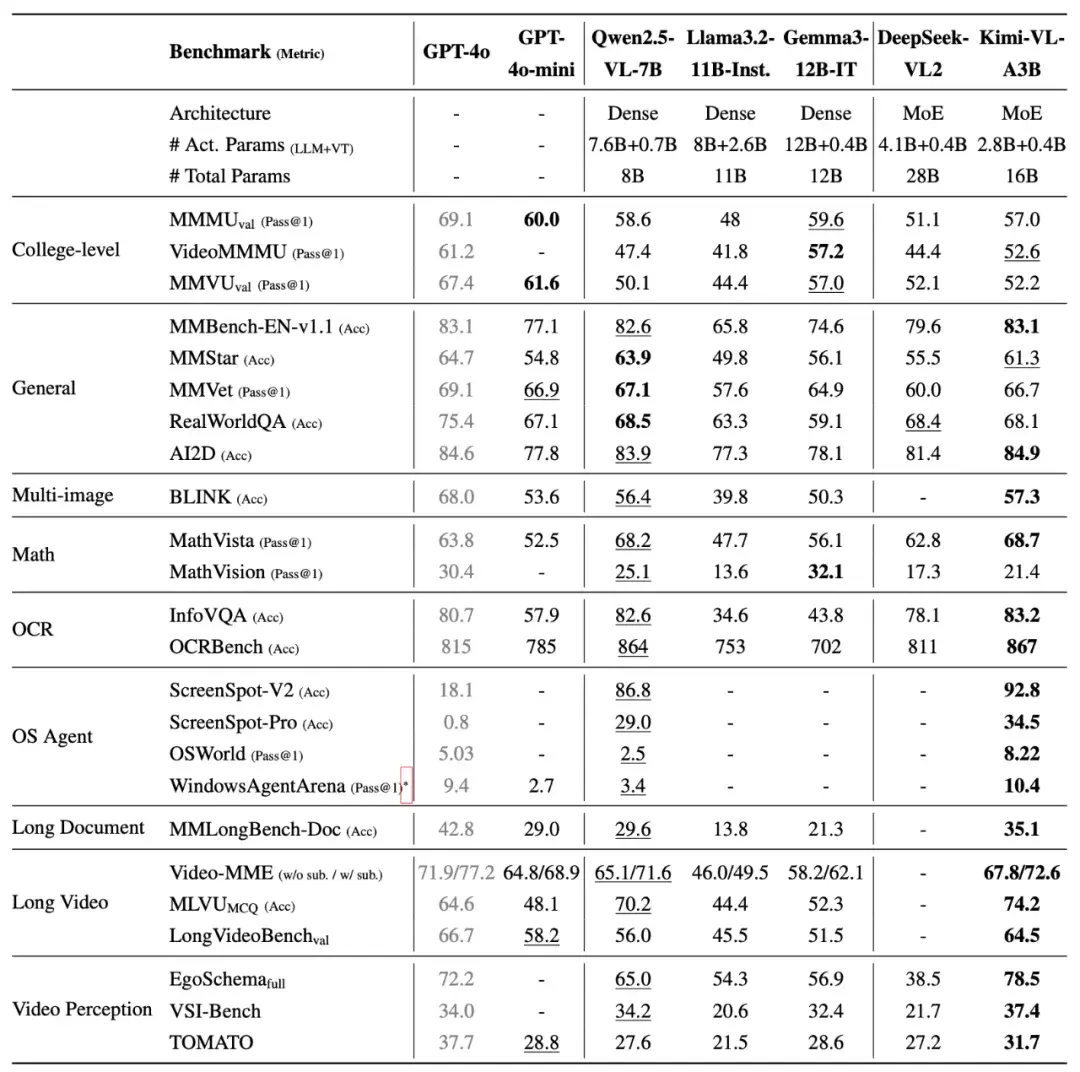 2)长上下文。Kimi-VL 的上下文长度是 128K,在长视频和长文档基准测试中(LongVideoBench和MMLongBench-Doc),以较大幅度领先同级别的其他模型。