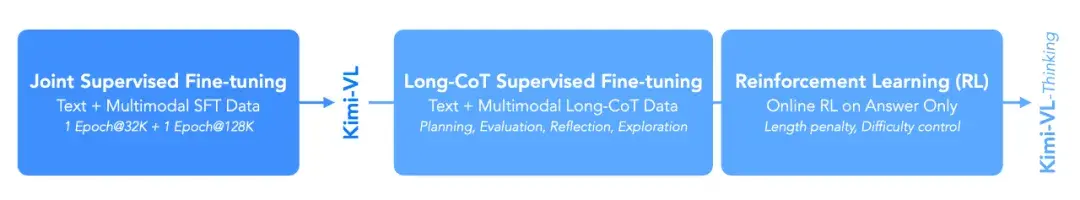 Kimi-VL 和 Kimi-VL-Thinking 的后训练阶段包括两个联合监督微调(SFT)阶段,分别在 32K 和 128K 上下文中进行,以及进一步的长链推理(Long-CoT)微调和强化学习(RL)阶段,以激活和增强长思考能力。