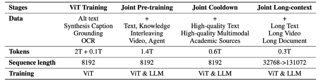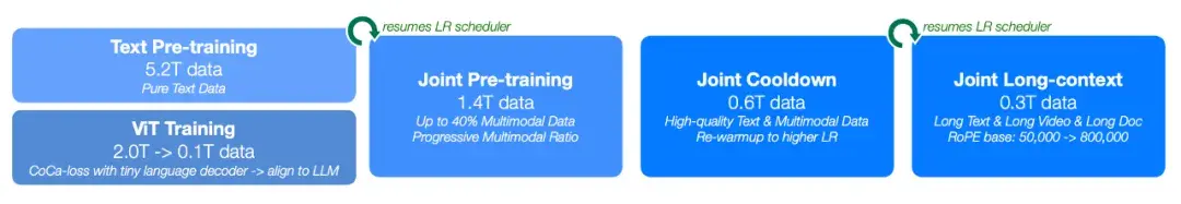 在加载了 Moonlight 预训练模型的中间检查点之后,Kimi-VL 的预训练总共包含 4 个阶段,整体消耗了 4.4T token:首先是独立的 ViT 训练,目的是建立一个强大的原生分辨率视觉编码器;随后是三个联合训练阶段(包括预训练 pre-training、冷却 cooldown 和长上下文激活 long-context activation),这些阶段旨在同时增强模型的语言能力和多模态能力。