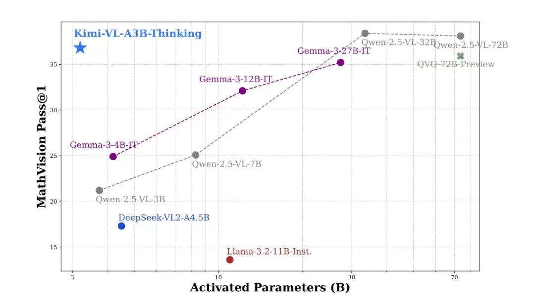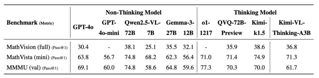 如上图所示,Kimi-VL-Thinking 媲美或超越了一些当前最先进的支持思维链(thinking)和不支持思维链(non-thinking)的模型:在 MathVista 上取得 71.3% 的成绩,优于 GPT-4o(63.8%)和 GPT-4o-mini(56.7%);在 MMMU 上得分 61.7%,超越了 GPT-4o-mini(60.0%)和 Qwen2.5-VL-7B(58.6%);在 MathVision 上达到 36.8%,超过了 GPT-4o(30.4%)、Gemma-3-27B-IT(35.5%),甚至 QVQ-72B(35.9%)。