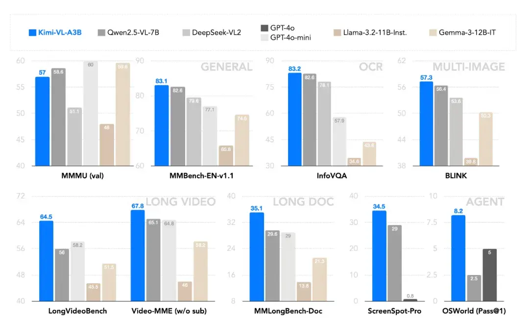 此外,我们在 Kimi-VL 技术报告中具体分析了模型在不同领域的性能表现,结果显示 Kimi-VL 在光学字符识别(OCR)、数学、智能体(agent)应用、长篇内容理解、多图像及视频感知等方面具备显著优势。