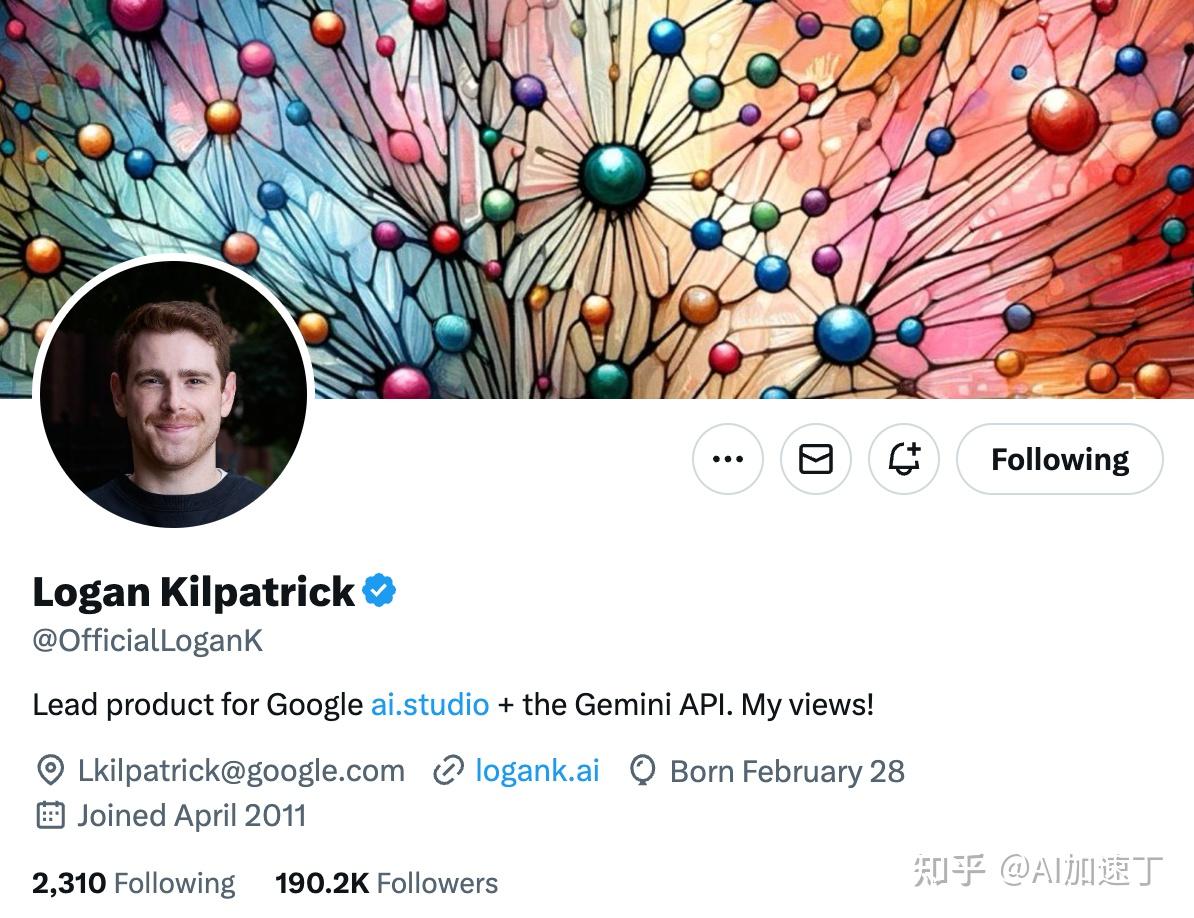 Logan Kilpatrick,是谷歌 AI Studio 和 Gemini API 的产品负责人。Google 相关的 AI 信息,关注他就可以了。