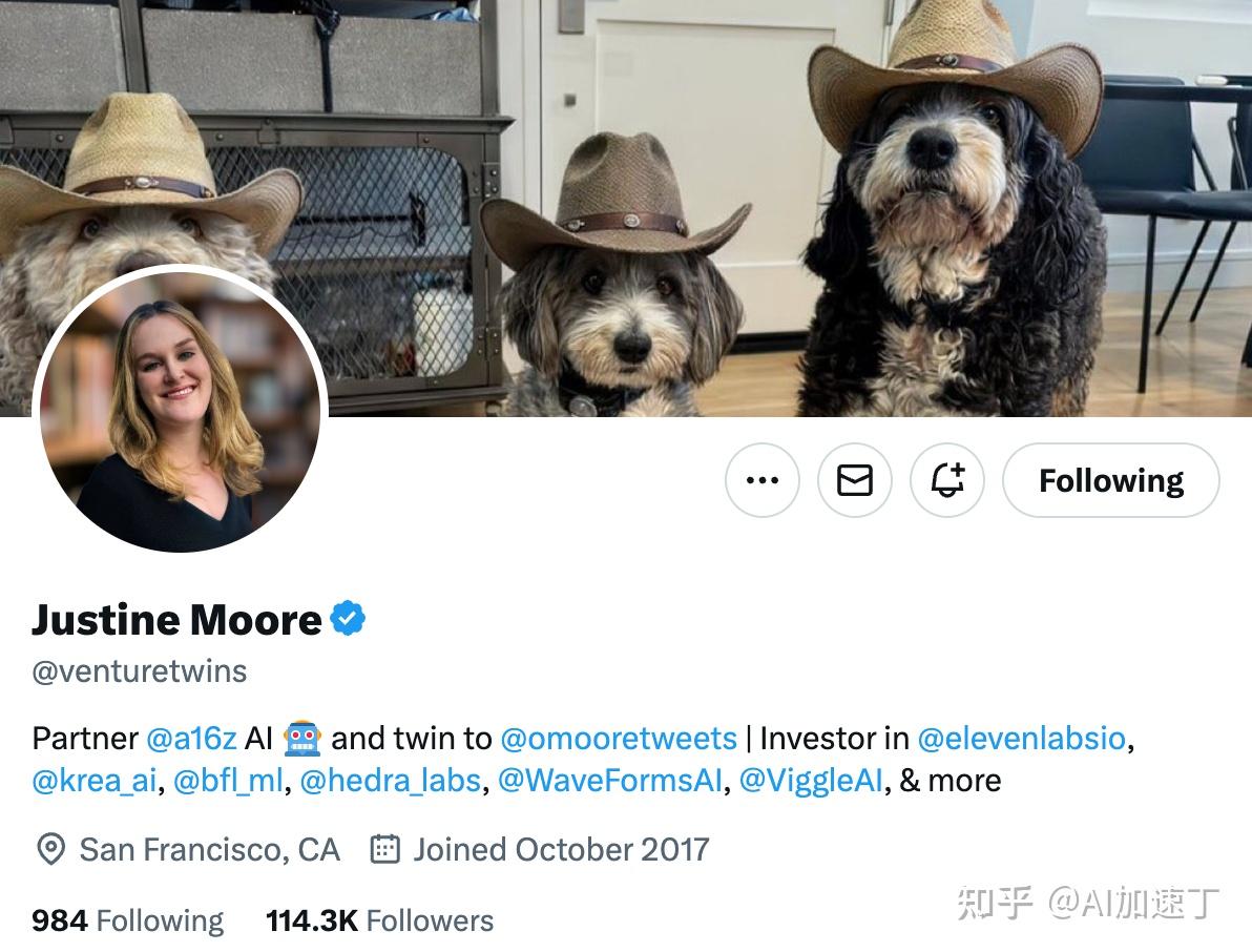 Justine Moore,是 A16z AI 合伙人。投资了 elevenlabsio、kreaai等比较知名的 AI 项目。