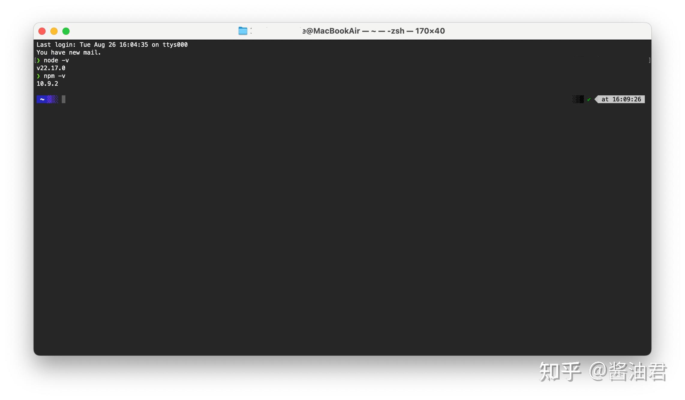 4. 打开终端: 在终端中输入 node -v 验证一下,看到下面的输出,就表示一切就绪,包括npm,ServBay也已经为我们准备好。