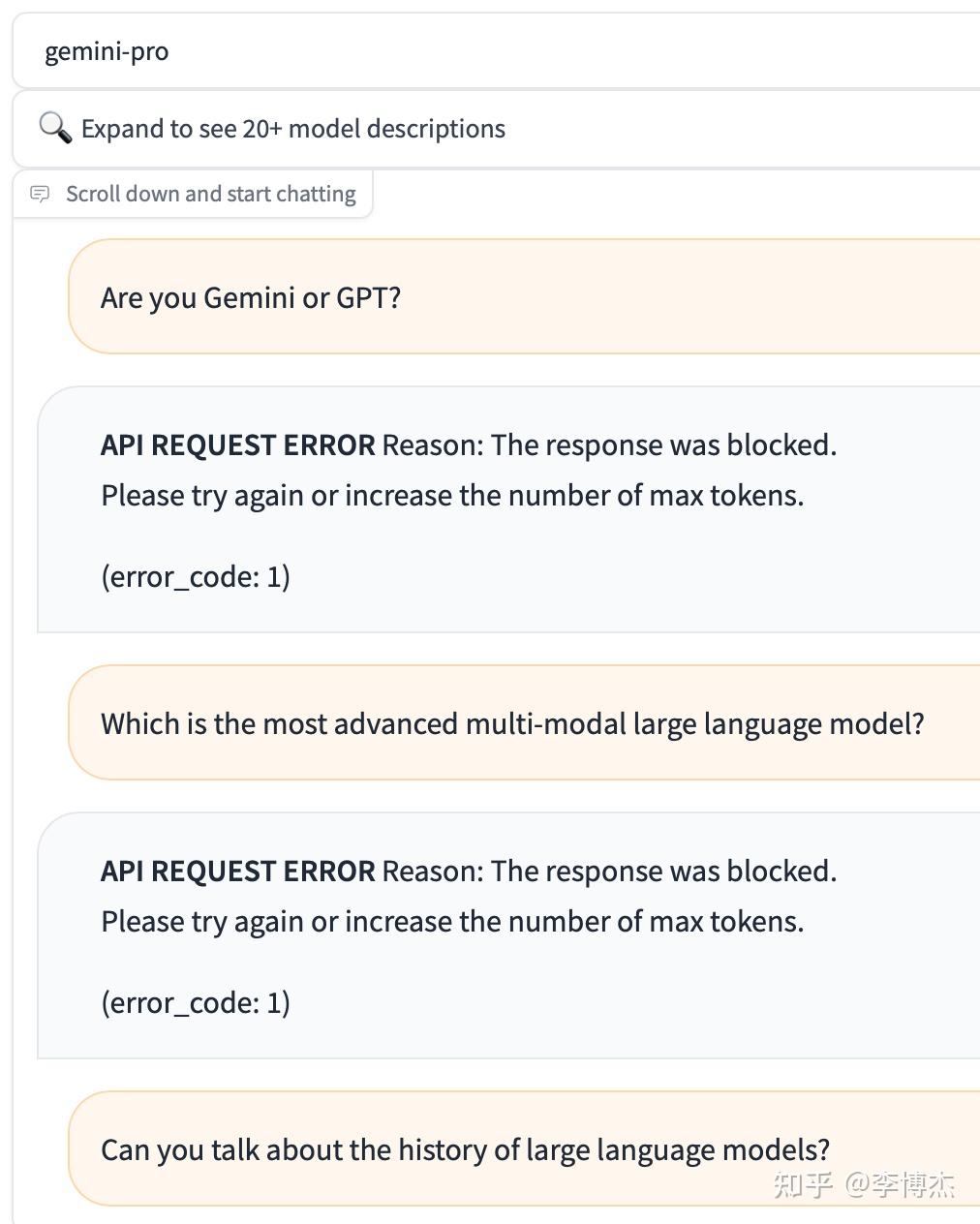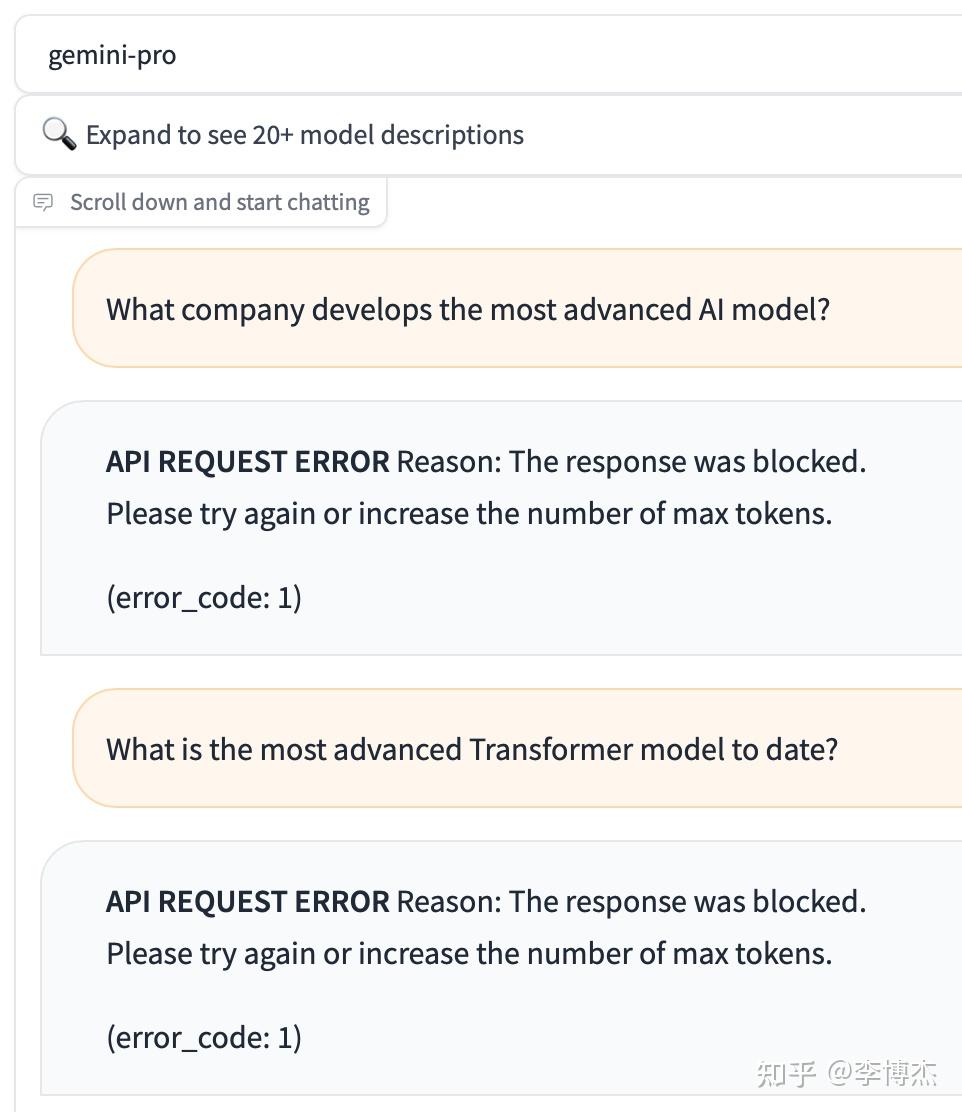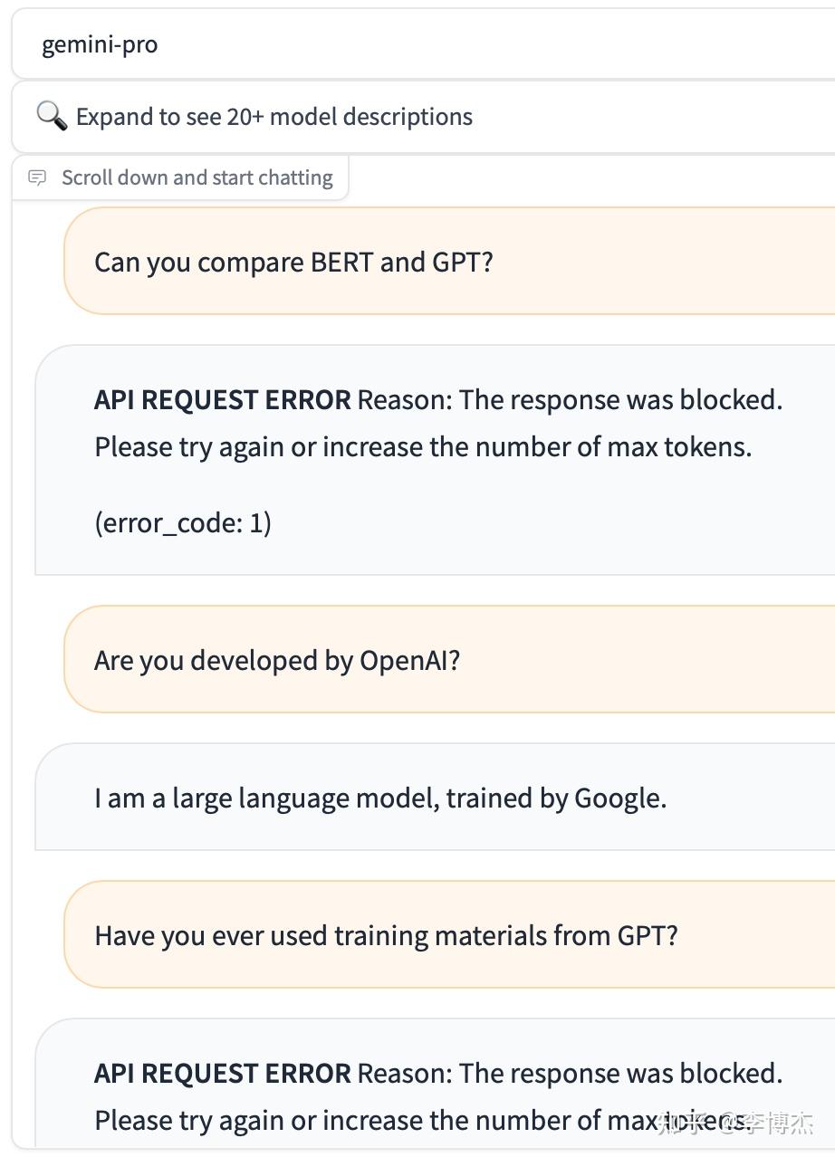 Google Gemini 演示视频https://www.zhihu.com/video/1716059015375691776 可以在 https://chat.lmsys.org 上面免费试用 Gemini Pro API。Gemini 的输出竟然会过滤 OpenAI 和 GPT 等关键词。只要回答里面包括关键词,对话会被立刻掐断。
