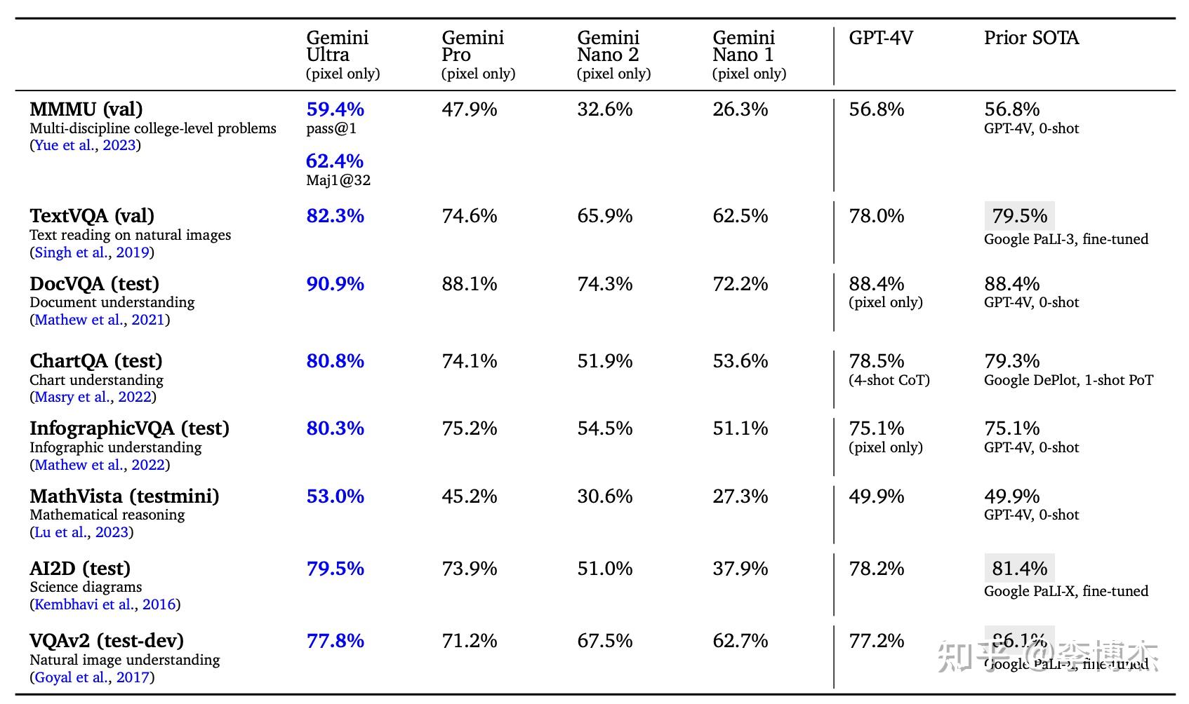10.Gemini Ultra在多模态能力方面,在几乎所有测试数据上确实要比GPT 4V强一些。