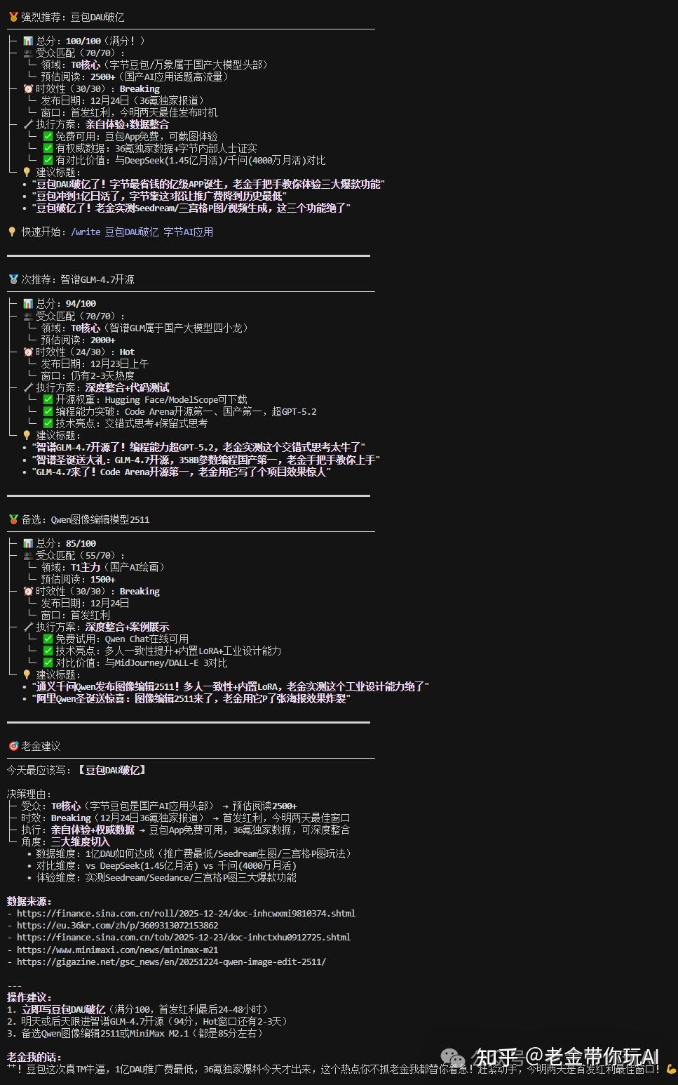 - 3. 爆款评分:按受众匹配度70% + 时效性30%算分,90分以上才推荐