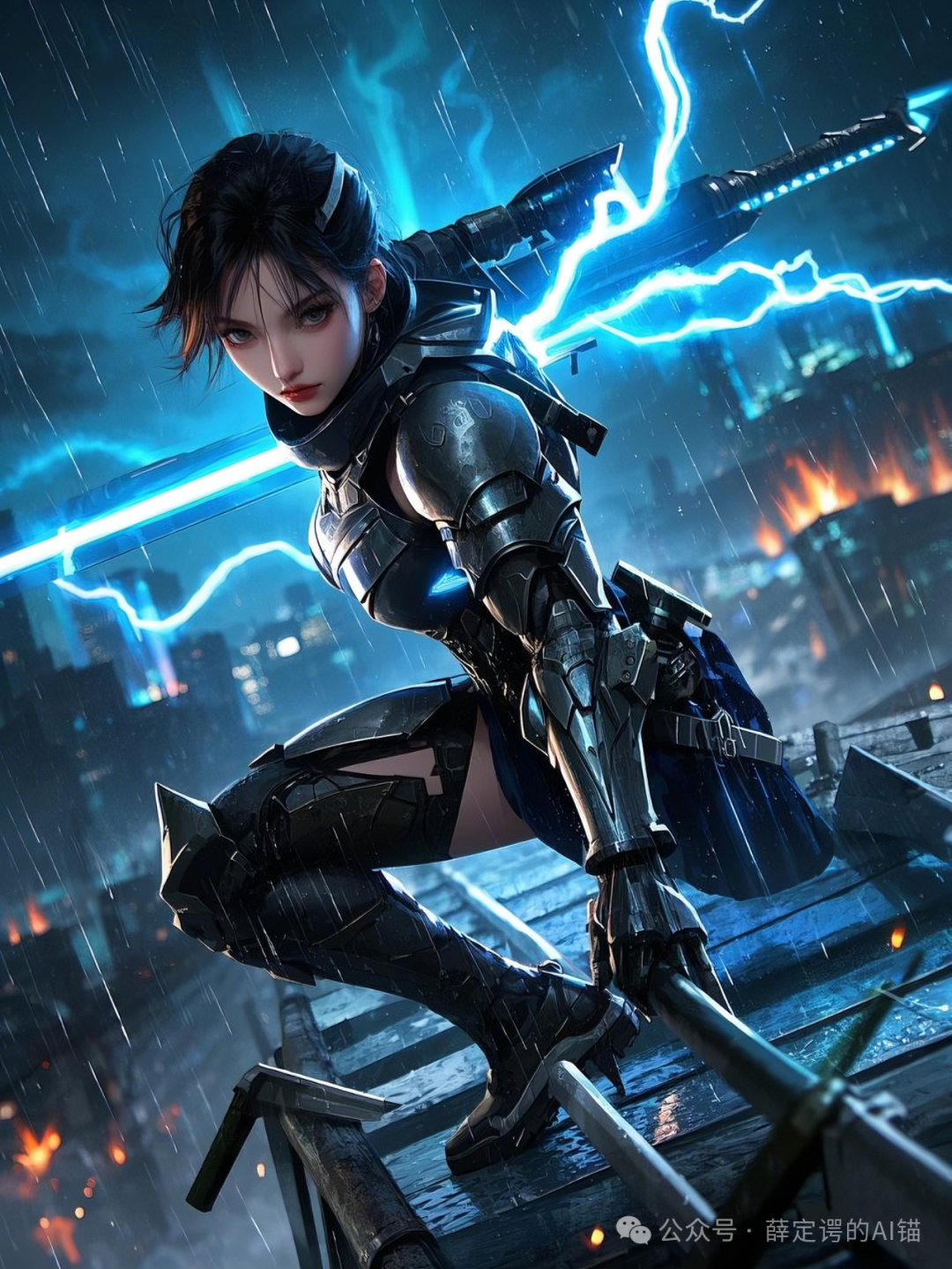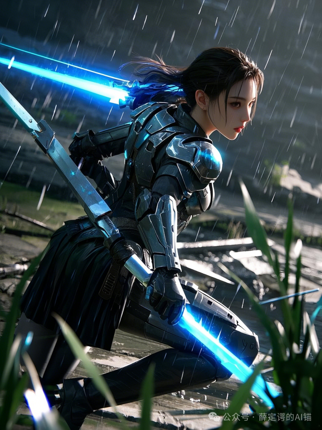 提示词2:女子鹅蛋脸泛柔光,朱唇轻启似低语,提裙踏竹桥;战士棱角分明的金属面庞流动蓝光,反握光刃弓步突进。暴雨梨花针与激光束轨迹交错,浅景深突显面部汗珠与装甲冷凝水,慢门拍摄动态残影。