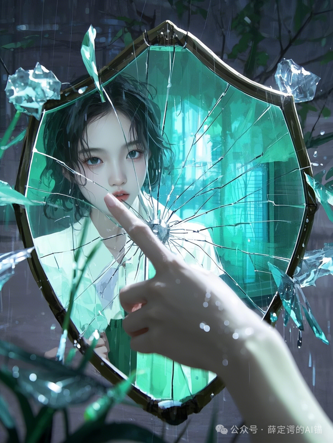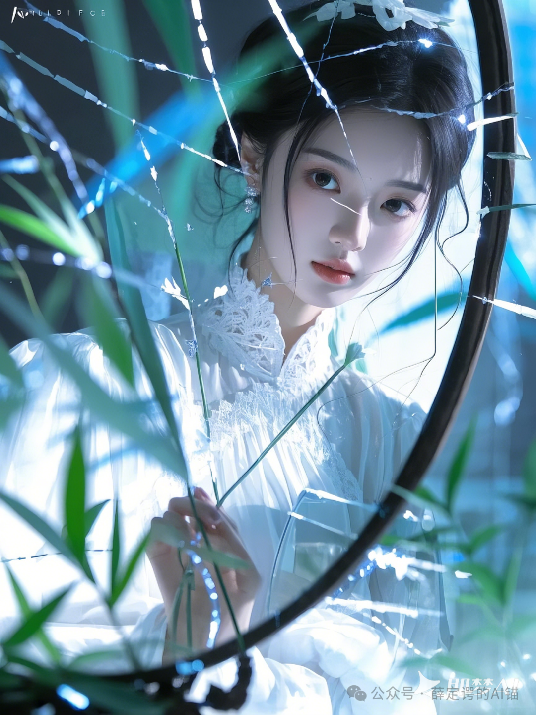 提示词1:破碎古镜中映出双重时空:镜外白衣女子指尖垂落银针雨,镜内赛博女性化作数据流光。传统水墨晕染与数码故障特效交织,青竹投影与全息代码重叠,浅景深聚焦镜面裂痕处飞溅的冰晶与像素颗粒。