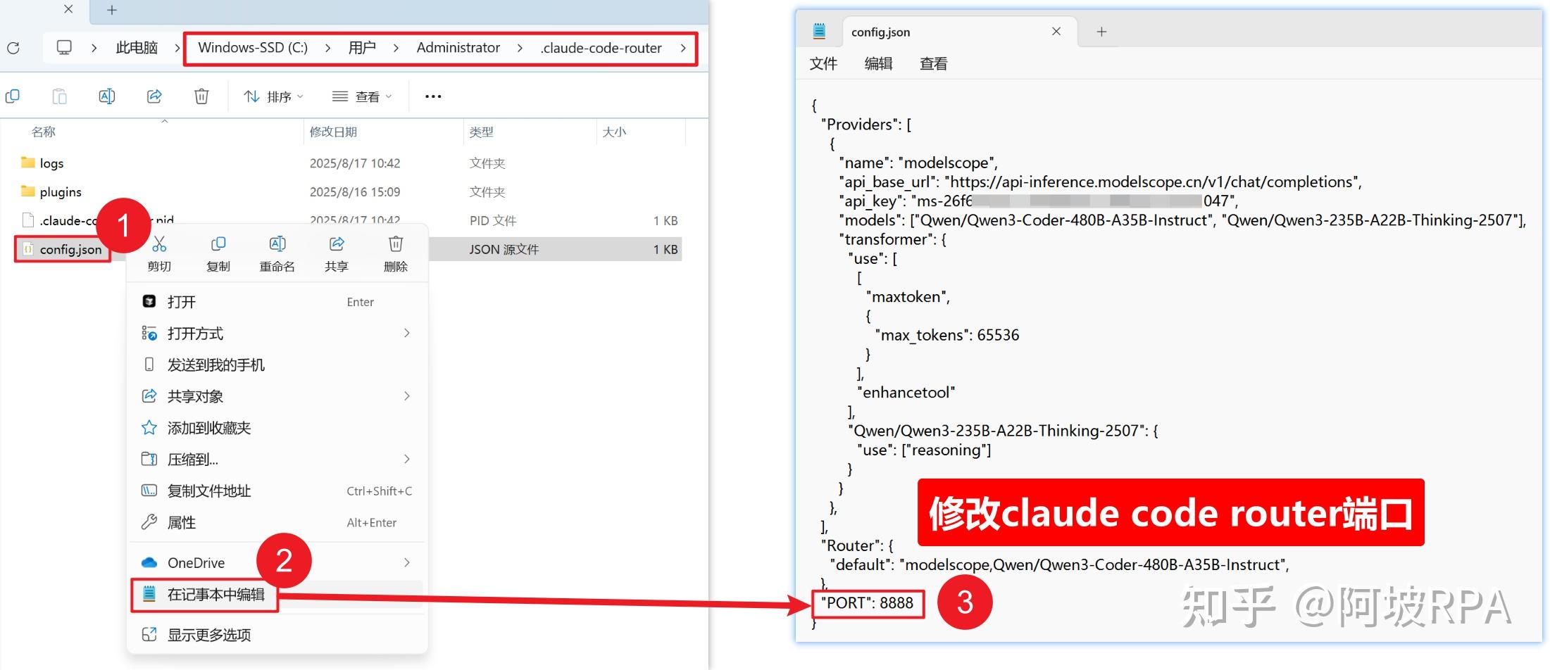 { "name": "modelscope", "api_base_url": "https://api-inference.modelscope.cn/v1/chat/completions", "api_key": "你的API KEY", "models": ["Qwen/Qwen3-Coder-480B-A35B-Instruct", "Qwen/Qwen3-235B-A22B-Thinking-2507"], "transformer": { "use": [ [ "maxtoken", { "max_tokens": 65536 } ], "enhancetool" ], "Qwen/Qwen3-235B-A22B-Thinking-2507": { "use": ["reasoning"] } } },