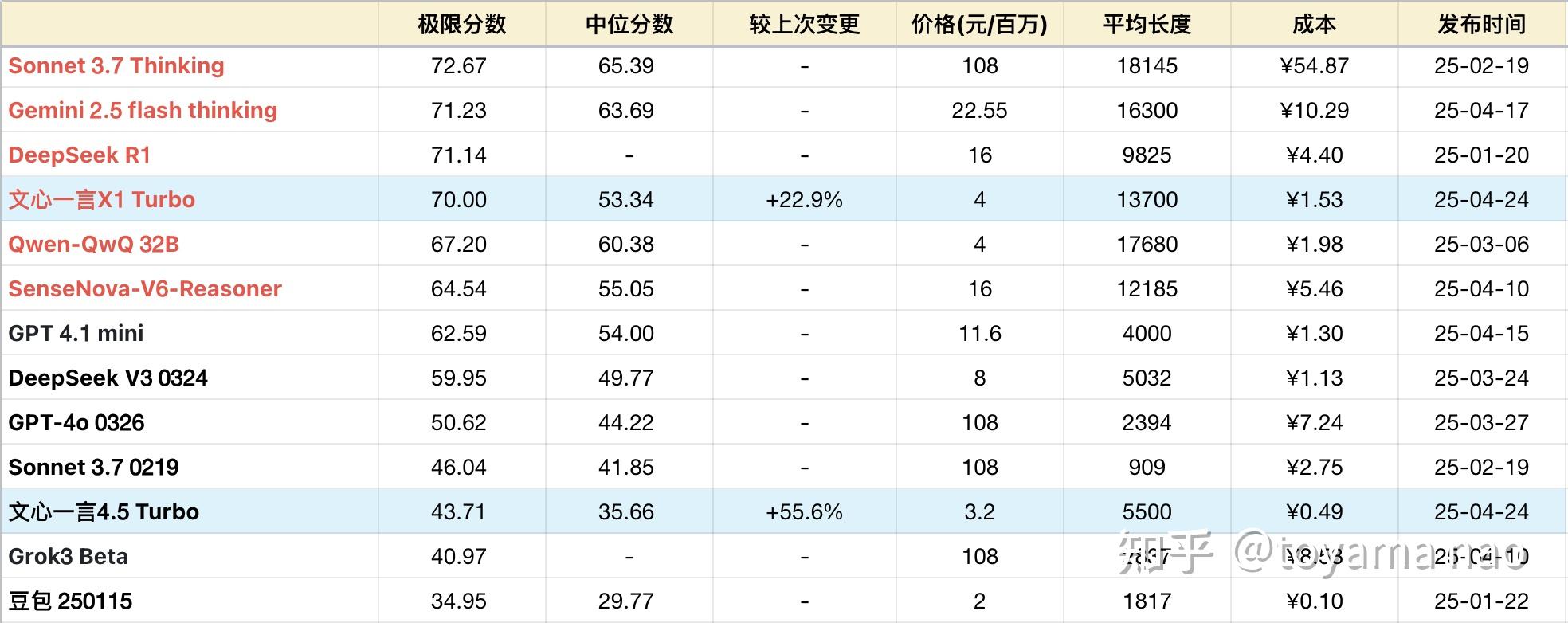 - 4.5turbo和x1turbo都存在大量死循环和中途切换到英文推理的现象。其中4.5turbo死循环率在10%,x1turbo略低,在9%。二者异常率都显著高于初版。疑似是过于激进的成本优化导致。