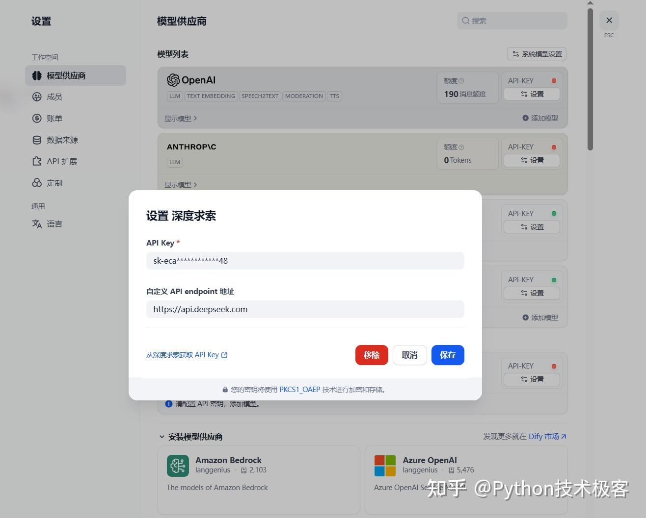 访问 Dify 平台,点击右上角头像 → 设置 → 模型供应商,找到 DeepSeek,将上文获取的 API Key 粘贴至其中。点击保存,校验通过后将出现成功提示。