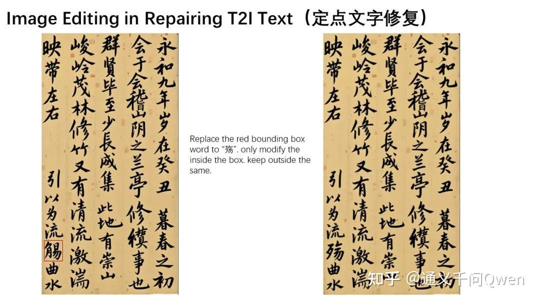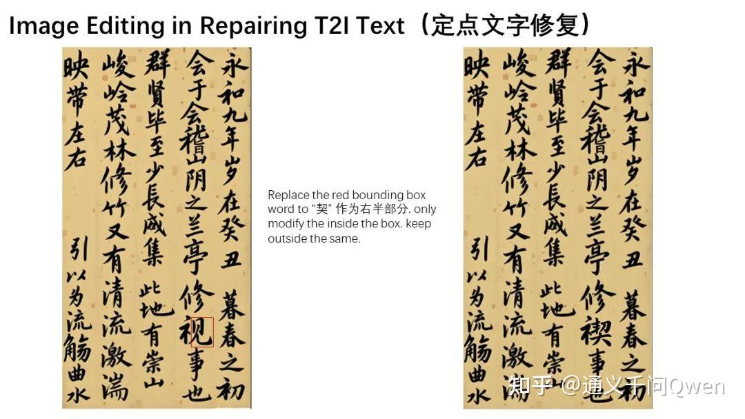 Qwen-Image-Edit的另一大亮点在于其准确的的文字编辑能力,这得益于Qwen-Image在文字渲染方面的深厚积累。如下所示,以下两个案例直观展示了Qwen-Image-Edit在英文文字编辑上的强大表现: