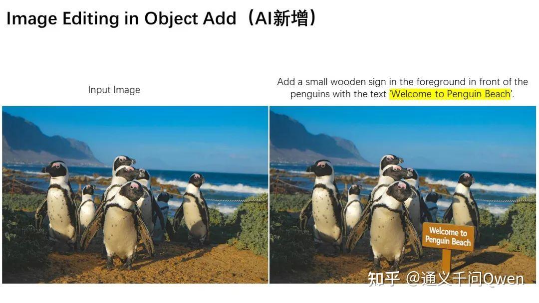 除了语义编辑,外观编辑也是常见的图像编辑需求。外观编辑强调在编辑过程中保持图像的部分区域完全不变,实现元素的增、删、改。下图展示了在图片中添加指示牌的案例,可以看到Qwen-Image-Edit不仅成功添加了指示牌,还生成了相应的倒影,细节处理十分到位。