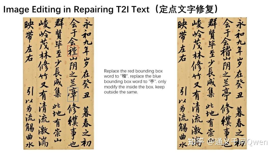 在这幅作品中,有不少汉字存在生成错误。我们可以借助Qwen-Image-Edit,逐步修复它们。例如,可以在原图中用方框标注出需要修改的区域,指示Qwen-Image-Edit针对这些部分进行修正。这里,我们希望红框内正确地写出“稽”字,蓝**域正确地写出“亭”字。